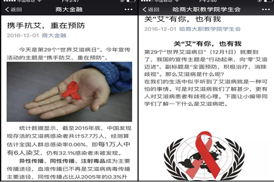 各学院也高度重视,精心筹划,开展了一系列主题鲜明、形式多样、内容丰富的艾滋病宣传活动,不仅包括开展主题讲座、举办征文比赛、制作宣传展板、编写团报等传统宣传教育活动,还不断创新工作模式和方法,将思政教育阵地搬到网络上,利用校园论坛、微信、微博、各类自媒体平台等网络新媒体,普及艾滋病知识,制作调查问卷,号召更多的同学加入抗艾队伍。一系列宣传活动的开展,在广大师生中产生了强烈反响,使学生预防艾滋病的意识不断增强。
