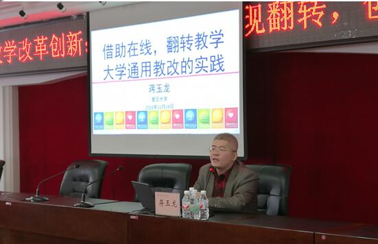 11月19日上午,蒋玉龙进行了题为“互联网+”教学改革创新专题讲座。他以“借助在线,翻转教学,大学通用教改的实践”为题,提出借助在线课程实现课堂教学翻转,以改变传统课堂教学模式的必要性与迫切性。他强调,翻转课堂旨在动摇大学教师单向知识传递的功能定位,将讲授内容视频化、文档化、电子化、信息化,促使学生学习过程纳入教学环节,从而提高课程教学效果。