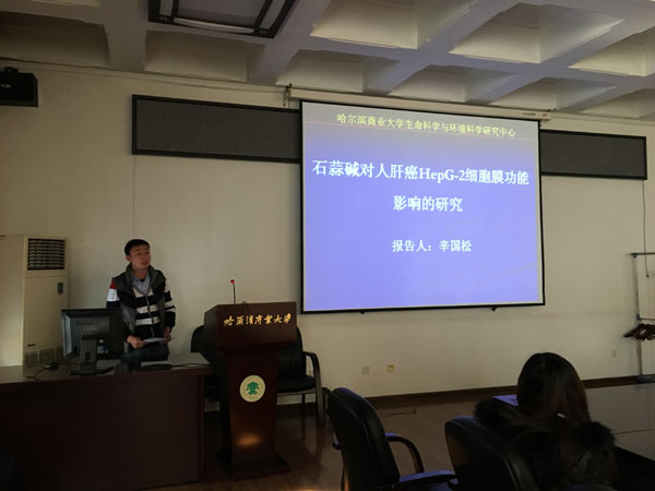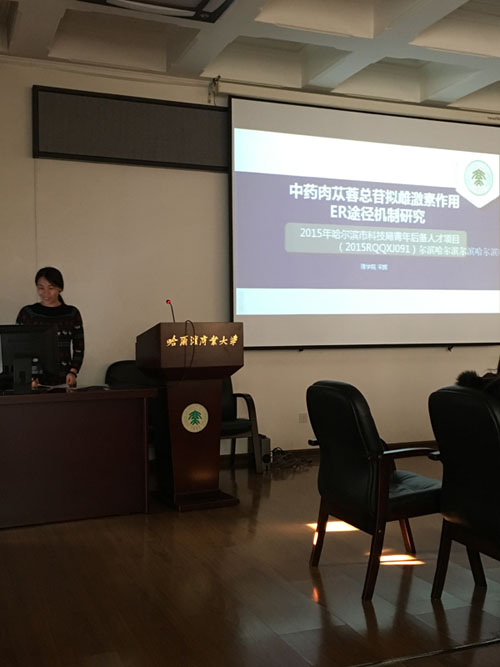 “太阳岛生物医药环境博士·博士后学术论坛”为哈尔滨商业大学第十届学术节的系列活动,论坛分为“论坛开幕式”和“论坛报告”两部分。哈尔滨商业大学中药学学科带头人季宇彬教授主持“论坛开幕式”并致辞,相关学科负责人、专家、教师、博士后、博士及硕士参加了本次论坛。哈尔滨商业大学理学院于淼博士后做了题目为《石蒜碱诱导人乳腺癌MCF-7细胞周期阻滞机制研究》的报告,哈尔滨商业大学理学院辛国松博士做了题目为《石蒜碱对人肝癌HepG-2细胞膜功能影响的研究》的报告,哈尔滨商业大学理学院宋辉博士做了题目为《肉苁蓉总苷拟雌激素作用ER途径机制研究》的报告,报告期间,参加论坛活动的硕士、博士和博士后与报告人围绕报告内容展开了活跃的互动交流,气氛热烈,营造了良好的学术氛围。