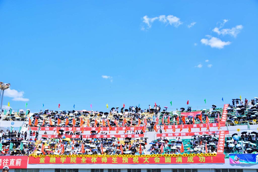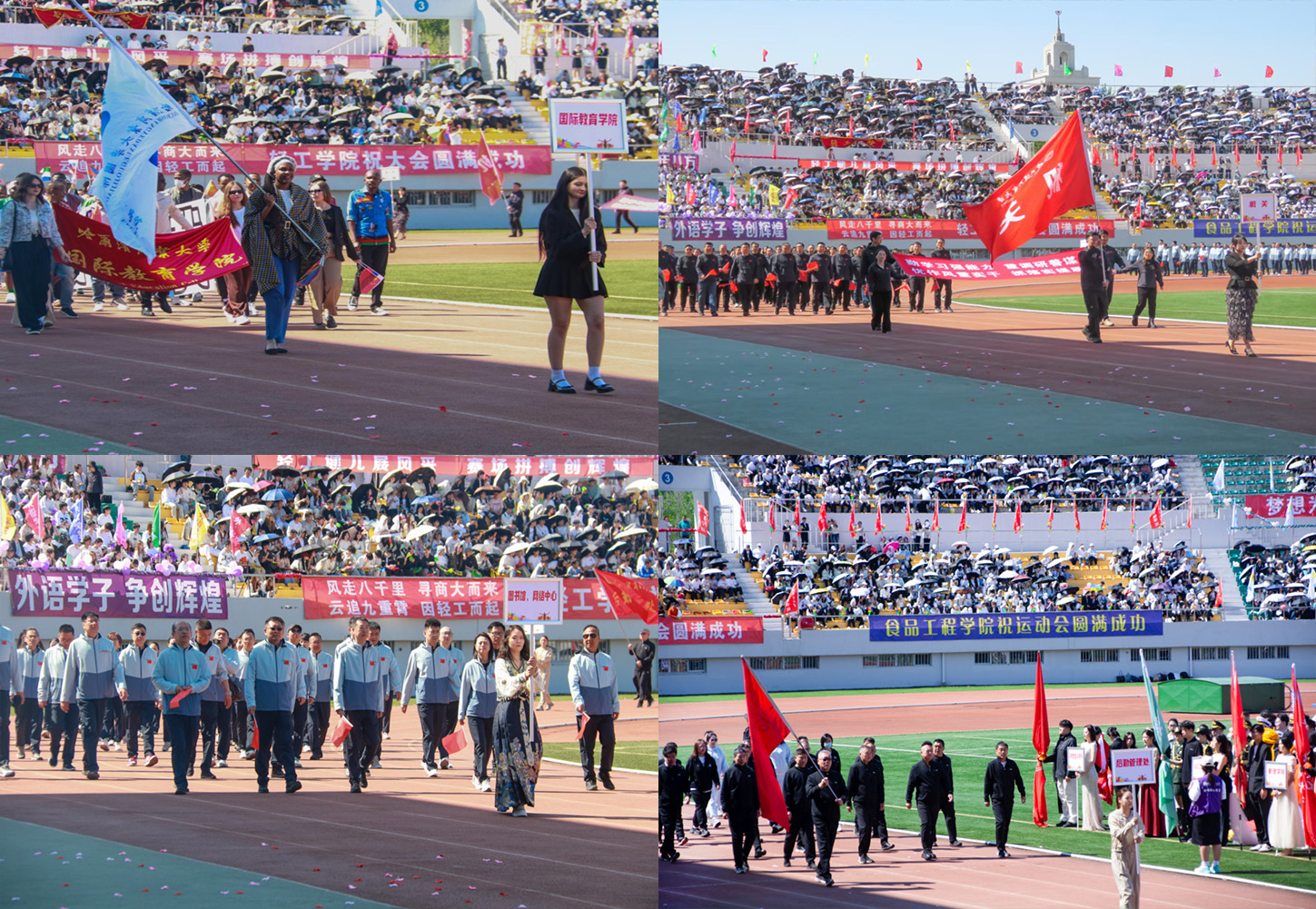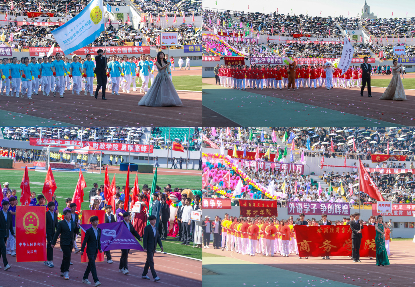 校大学生艺术团和各学院带来了充满青春活力和时代气息的啦啦操表演。随着动感的音乐响起,同学们的每一个动作都精准而有力,洋溢着青春的激情与活力,充分体现我校广大学生的昂扬风采和蓬勃朝气。统战部与学生工作部联合组织各民族师生带来了“中华民族一家亲”民族舞蹈。各民族师生身着斑斓的民族盛装,用跃动的舞蹈演绎着“中华民族一家亲”的深情篇章,脚步踏响的是“团结奋进、追求卓越”的哈商大精神,手臂扬起的是中华民族伟大复兴的共同愿景,舞蹈最后以“石榴籽”造型定格,运动场上响起雷鸣般的掌声。