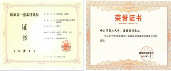 法学专业课程思政建设取得了较为显著的阶段性成果。2021年,法学专业获批黑龙江省一流本科专业建设点;2013年,“民商法学”学科获评省级领军人才梯队;2023年,法学院第三次被聘为省政府法律顾问单位。学院共有两门省级课程思政建设示范课程——《婚姻与继承法》(2020年)和《民事法律诊所实训》(2021年)。2023年,《社区法律诊所实践(法律援助实践)》获评国家级一流本科课程,《法理学》获评省级一流本科课程;2024年,《婚姻家庭法律诊所》作为产教融合课程,获校级优质课程立项,《法理学》获评校级课程思政示范课程和教学团队培育项目。2021年,司丹副教授获省高校课程思政教学竞赛优秀教学设计案例1项、省高校课程思政教学竞赛二等奖1项;2023年,获第三届全国高校教师教学创新大赛(黑龙江赛区)三等奖。学院教师获全国法律援助工作先进个人1人,全国文化科技卫生“三下乡”活动服务标兵1人;省级教学名师1人,省高校课程思政建设教学名师1人,省级师德先进个人3人,省级模范教师1人;校级教学名师2人,校级教学新秀奖1人。《民法分论》教学团队获评校级课程思政示范教学团队。2022年,《习近平法治思想融入法科学生思想政治教育全过程研究》获国家社科基金高校思想政治理论课研究专项立项;专著《大学生法律援助立德树人培养机制研究》获评省社科联省教育学学科优秀成果一等奖;2024年,《新时代卓越法治人才“德法兼修”培养机制的构建与实践》获黑龙江省高等教育(本科)教学成果奖二等奖;近四年,获课程思政教学改革项目立项省级4项、校级2项。