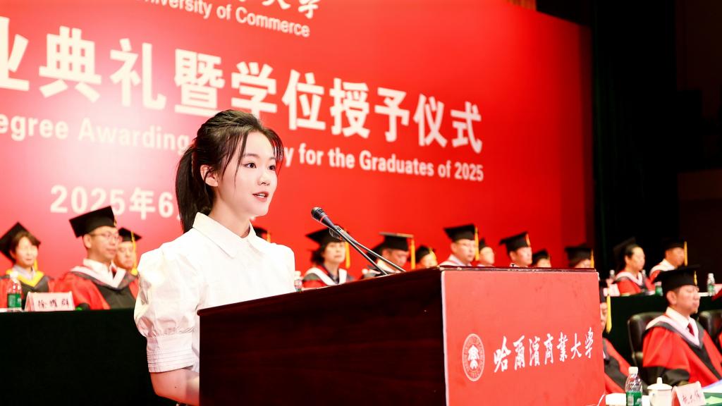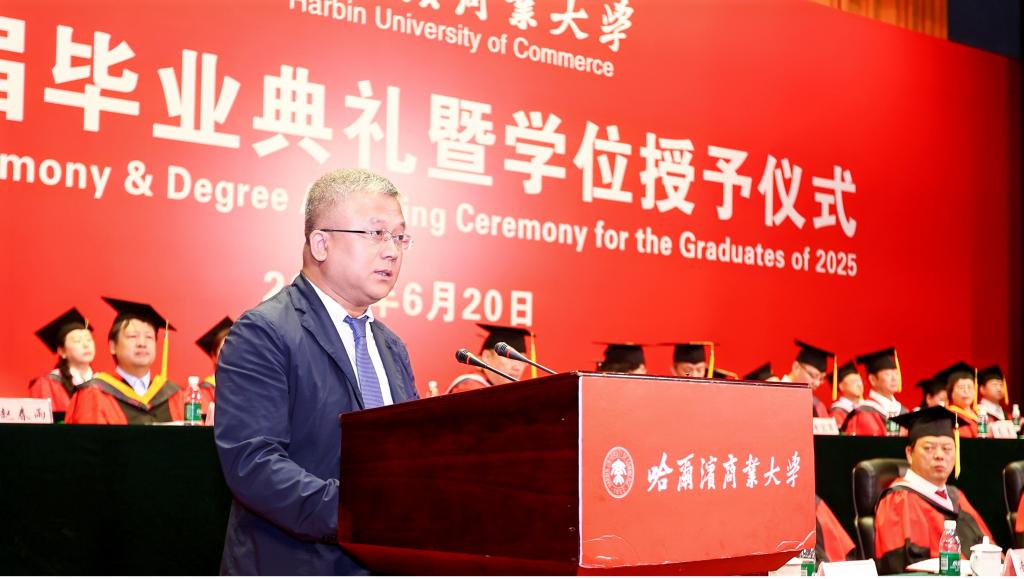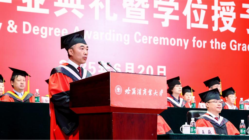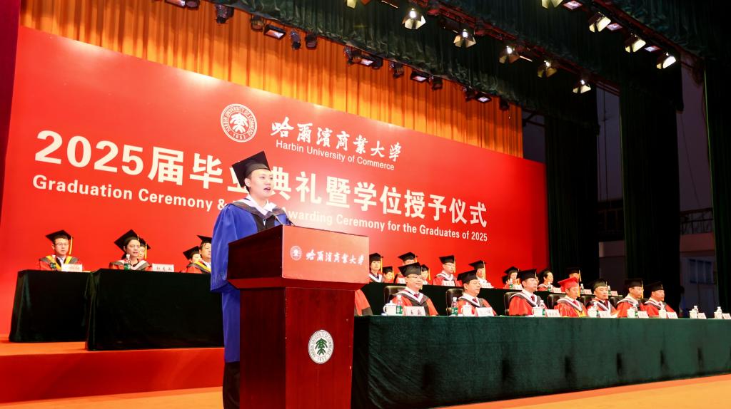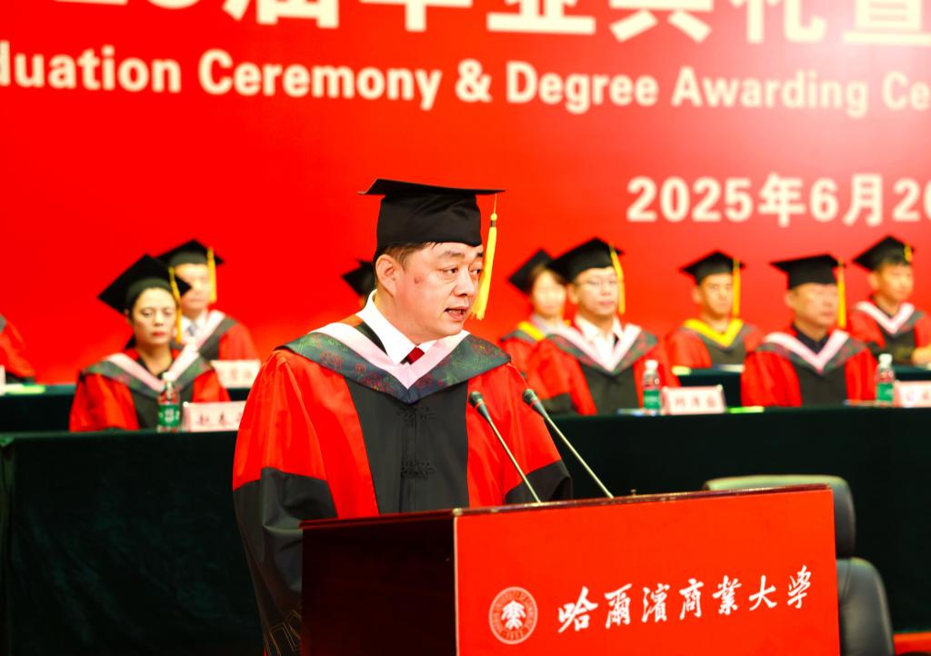 李景义校长以《“向上·向深·向善” 传大商之道 做有为青年》为题发表了热情洋溢的讲话。李景义代表学校向全体毕业生表示最热烈的祝贺,并与毕业生们一起回顾了奋斗前进的成长、跨越和蜕变历程以及学校发展建设取得的成果成效。李景义寄语毕业生们,要永葆“向上”的锐气,在祖国大地上书写壮丽的人生,勇担强国使命,争当强国先锋,把“小我”的青春奋斗融入“大我”的时代洪流,让蓬勃青春在强国建设、民族复兴的伟业中大放异彩;要涵养“向深”的静气,在时代喧嚣中守护灵魂的灯塔,踏踏实实努力,扎扎实实精进,向前走、向远看,不断实现个体的成长和飞跃;要常怀“向善”的暖意,在成就自我中照亮他人,永远对他人怀抱善意,对社会肩负责任,把智慧与温暖化作推动社会进步的力量。李景义动情地说道:“亲爱的同学们,从今天起,你们拥有了一个共同的名字——‘哈商大校友’。母校将永远深情凝望你们的身影,为你们的每一次拼搏加油,为你们的每一点收获喝彩,为你们的每一份成功骄傲。愿你们胸中有火、眼中有光、脚下有路,在中华民族伟大复兴的壮阔征程中,以青春为笔、以奋斗为墨,奋力书写无愧于时代、无愧于梦想的人生华章,在人类文明的星图上刻下属于你们这一代人的璀璨坐标!”