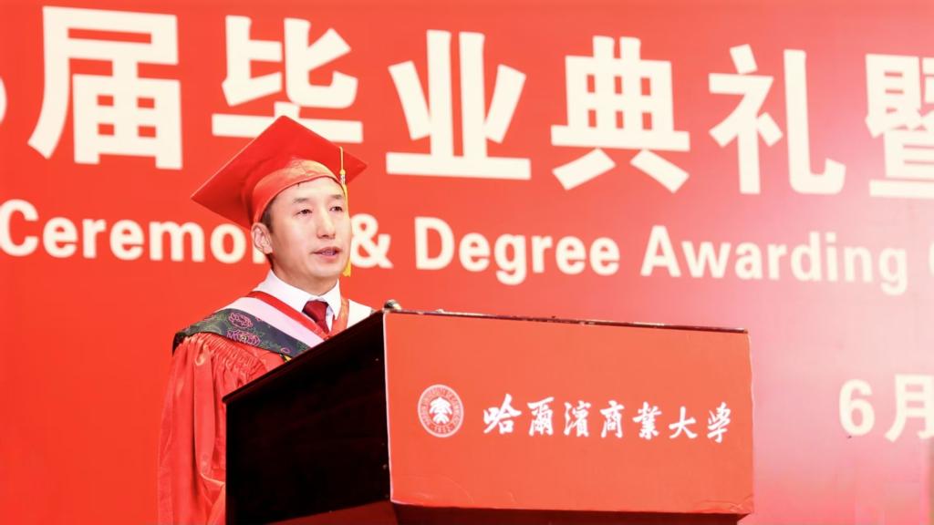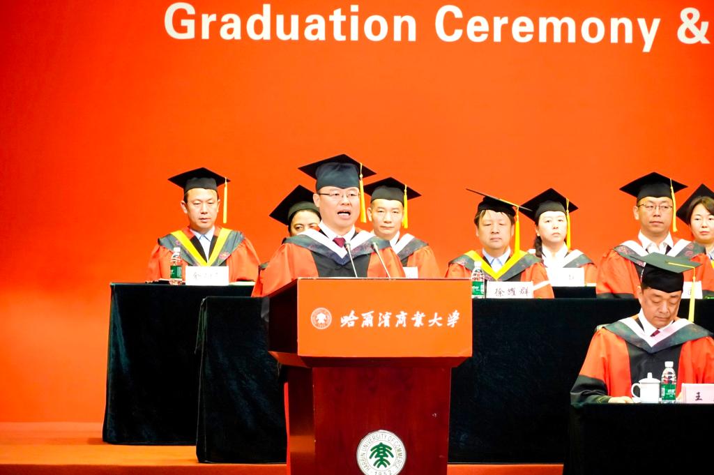 教师代表、管理学院博士生导师魏胜教授祝贺毕业生们在哈商大这片知识的沃土上完成了从寻梦的启航者、追梦的跋涉者到圆梦的收获者的壮丽蜕变,嘱托毕业生们要永葆“寻梦者”的好奇与热忱,赓续“追梦者”的实干与坚韧,胸怀“圆梦者”的格局与担当,以更加昂扬的奋进姿态,迎接人生的每一个挑战,书写无悔的青春篇章,用智慧和汗水浇灌更有高度、更有境界、更有分量的青春梦想。