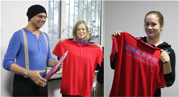 国际合作处的工作人员和留学生代表向外教们赠送了鲜花、水果和T恤衫。