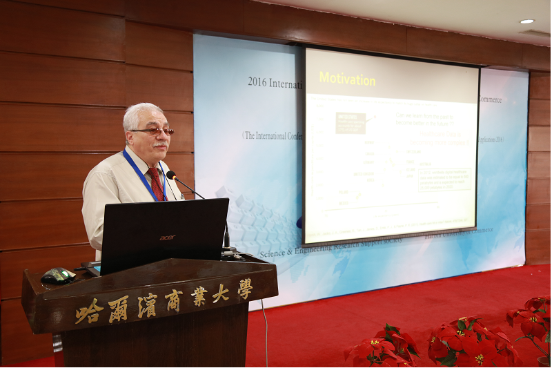 张晓丹在致辞中指出,我们已经进入一个信息化的时代,以互联网为代表的信息通信技术日新月异,“互联网+”已成为推动创新发展的时代先锋和突出代表,正在引领社会生产新变革,创造人类生活新空间,改变着我们对世界的认知,改变着我们的生产方式和生活品质。本次会议的召开,将推进信息技术与电子商务领域间的国际交流与合作。张晓丹向国内外专家学者介绍了哈尔滨商业大学悠久历史传统与近期发展成就。肯定了计算机与信息工程学院近年来所取得的成绩,并代表哈尔滨商业大学对参会专家表示热烈的欢迎。