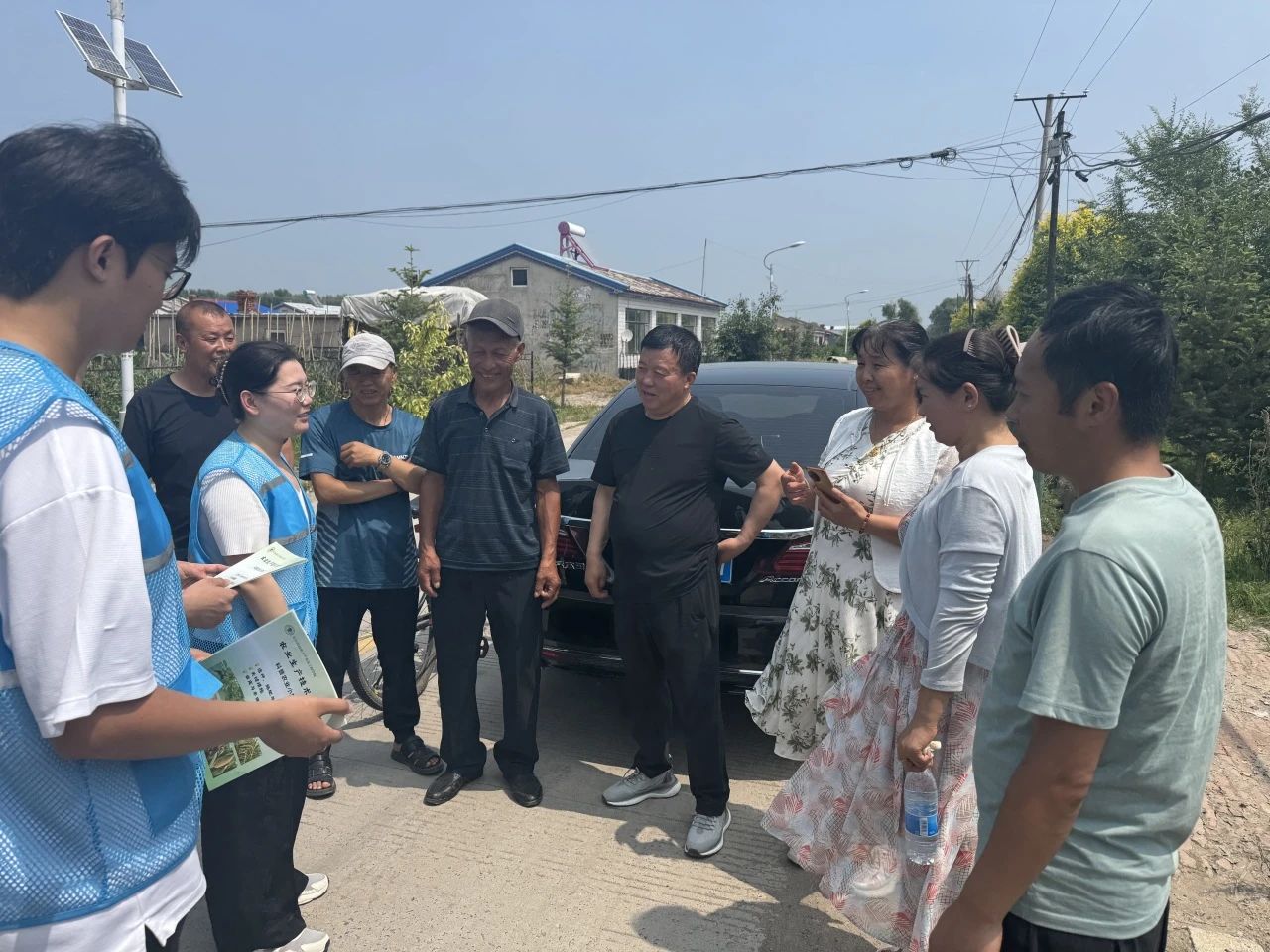 实践团走访肇东市农业农村局,师生们与李局长深入交流,全面了解肇东市推动乡村发展的重要举措、整体规划与实际需求;随后深入当地乡村振兴重点村—姜家镇张乡屯,感受党建引领下乡村发展的蓬勃风貌。实践团在村书记带领下来到田间地头观察玉米长势,学习最新惠农政策和种植技术;在与村民交谈中了解乡村文明建设情况,走进农户家为村民们科普食品安全知识、传播专业的农业种植常识。