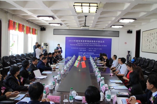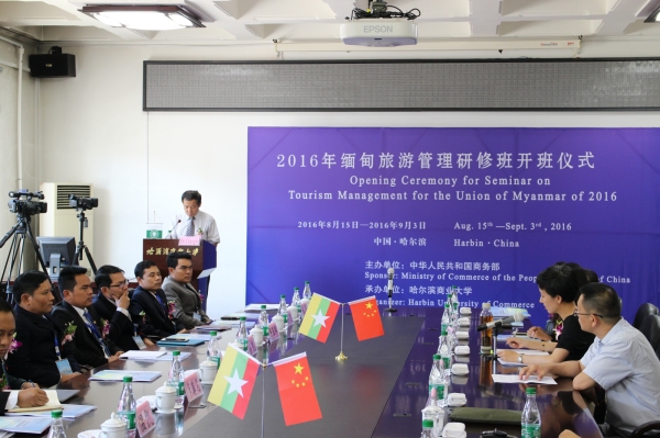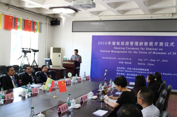 8月15日上午,由哈尔滨商业大学承办的中华人民共和国商务部人力资源援外项目缅甸旅游管理研修班的开学典礼在哈尔滨商业大学南校区主楼会议室隆重举行。本次研修活动的学员是来自缅甸的二十位旅游业的官员和业务人员,他们将在我校进行为期二十天的研修活动。