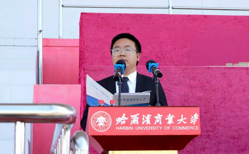 马克思主义学院2023级马克思主义理论专业硕士研究生、黑龙江省青年讲师团讲师杨涵元作为在校生代表发言。杨涵元说:“回首在商大的求学时光,从本科生到研究生,这片土地给予了我太多的滋养与力量。作为一所具有深厚历史底蕴和鲜明学科特色的高校,哈尔滨商业大学不仅教会了我专业知识,更塑造了我的人生观与价值观。在老师的言传身教和学校组织开展的各类活动中,我认真学习和深刻体悟了商大深厚的家国情怀与历史使命感,商大人艰苦奋斗、敢为人先的创新精神,‘求真至善 修德允能’的校训精神所蕴含的追求卓越与奉献社会的价值导向。亲爱的学弟学妹们,从此刻起,你们与商大的未来紧密相连。这里将是你们探索自我、实现梦想的广阔舞台。愿你们珍惜时光、脚踏实地,在商大书写属于你们的精彩篇章。让我们携手并进,以青春之我、奋斗之我,为民族复兴铺路架桥,为祖国建设添砖加瓦。”