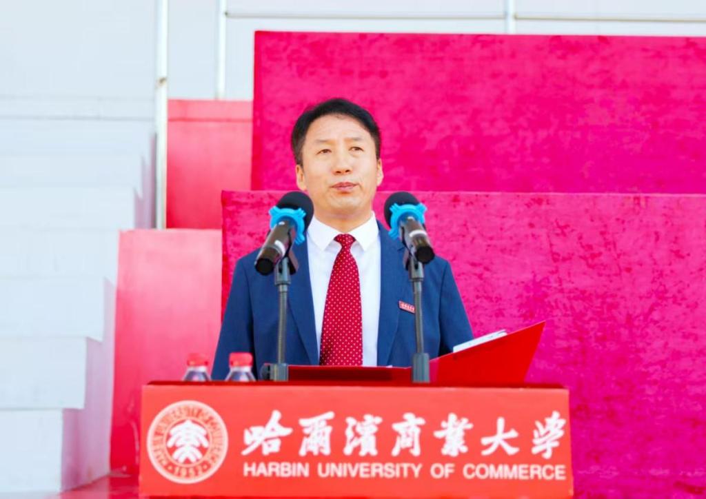 李景义对全体2025级新同学表示热烈欢迎。他动情地说道“从这一刻起,‘商大人’这个光荣的称号,将成为伴随你们一生的身份印记;从这一刻起,你们将在这片北疆沃土上走过春华秋实,在知识的滋养与实践的锤炼中,解锁人生的无限可能;从这一刻起,哈商大七十余载砥砺前行积淀的光荣传统、严谨学风与人文精神,将在你们身上实现新的传承,赋予新的内涵。相信你们必将以青春之力,续写商大荣光,成为学校未来最值得骄傲的闪亮名片。”李景义向新同学们介绍了哈尔滨这座城市的历史文化、气候特点、景观特色以及学校办学历史、学科专业建设、师资力量、人才培养、校园规划等方面情况。围绕如何度过有价值的大学时光,李景义对同学们提出三点希望。一是以自律铸品德,守好人生“方向盘”,从日常学习生活的小事做起,按时上课学习、独立完成科研、遵守校规校纪、坚持运动健身,真正将“求真至善 修德允能”的校训融入自己的一言一行。二是以自立强本领,练就成长“硬功夫”,培养独立人格与批判思维,学会质疑、善于质疑,始终保持独立思考和判断,敢于打破思维定式,让理性之美塑造独特人格。三是以自强担使命,扛起时代“接力棒”,要有“天行健,君子以自强不息”的品格,更要有“兴商富民、福泽万邦”的情怀,不负韶华、奋发有为,努力成为国家建设、民族复兴的有用之才、栋梁之材。希望同学们在商大这段逐梦之旅中,能够不断学习知识、锻炼能力、锤炼品格、强壮身体,修“厚德载物”之品性,炼“自强不息”之精神,放飞梦想,成就未来,做心怀梦想、勇毅前行的商大英才。