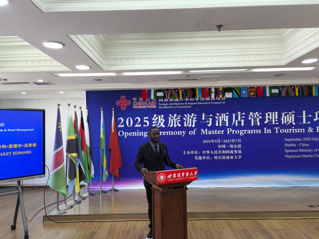9月18日上午,由商务部主办、哈尔滨商业大学承办的“2025级旅游与酒店管理”援外培训硕士项目开学典礼在我校举行。商务部国际商务官员研修学院党委副书记、纪委书记郑乐,黑龙江省商务厅二级巡视员韩东安,校党委常委、副校长王福友出席典礼;我校国际教育学院、旅游烹饪学院相关人员以及来自阿尔及利亚、埃塞俄比亚、斯里兰卡等13个国家的30名新同学参加开学典礼。