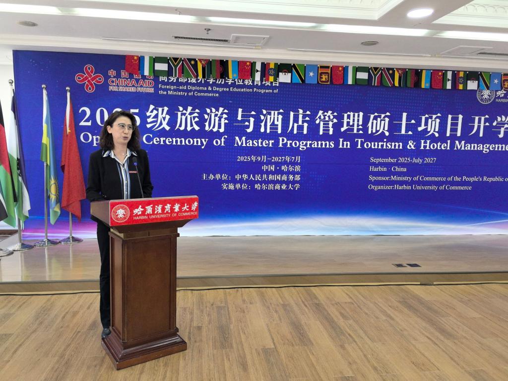 韩东安代表黑龙江省商务厅致辞。他指出,中国始终秉持“人类命运共同体”理念,坚持通过知识共享与能力建设,实现共同发展与繁荣。中国旅游业近年来产业规模持续扩大,新产品、新业态层出不穷,数字化、智慧化转型步伐加快,国际竞争力与影响力显著提升。希望同学们能够学有所成、载誉而归,把所学应用到工作中去,服务于所在国家的社会发展和人民生活的改善。