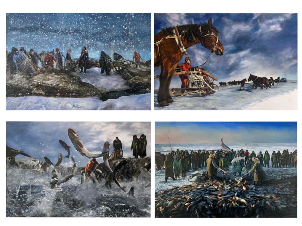 金奖作品《冰湖之韵·渔歌悠扬》,以组画形式,聚焦于冬日冰面捕鱼的场景。画面中,人们在漫天飞雪里合力拉网的协作瞬间,展现出劳动的艰辛与集体的力量,传递出劳动者对生活的热忱与自然馈赠的喜悦。此外,从整个场景的氛围来看,展现出一种质朴、纯粹的生活状态,营造出“风清气正”的环境。它提醒着人们,在追求物质生活的过程中,要保持廉洁自律,不被贪欲所左右,如同冰面那般纯净无污,坚守住内心的道德底线,秉持廉洁奉公的原则,让社会充满清正廉洁的风气。