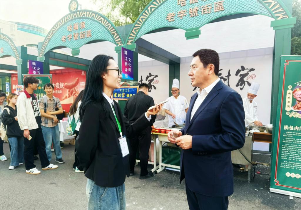 老厨家第四代传承人、我校1997届烹饪专业校友郑树国在采访中表示,参加嘉年华活动不仅能让同学们品尝地道美食,更能够传递美食背后的文化内涵,增强大家对哈尔滨历史与城市文化的认同。作为商大校友,自2023年起,郑树国每年坚持返校参加活动,见证了越来越多学子关注“老字号”,更深感肩负着传播家乡饮食文化、让更多外省学生爱上“第二故乡”的责任。郑树国始终将哈尔滨商业大学“求真至善 修德允能”的校训精神深植于心、外化于行。在父亲“慎终如始”的谆谆教诲与商大育人理念的双重滋养下,他持续扎根龙江大地,积极推动传统美食文化走进青年群体、融入校园生活,以实际行动助力龙江文化建设提质增效,为龙江人才培养注入文化养分,彰显“老字号”传承人的社会责任与时代担当。