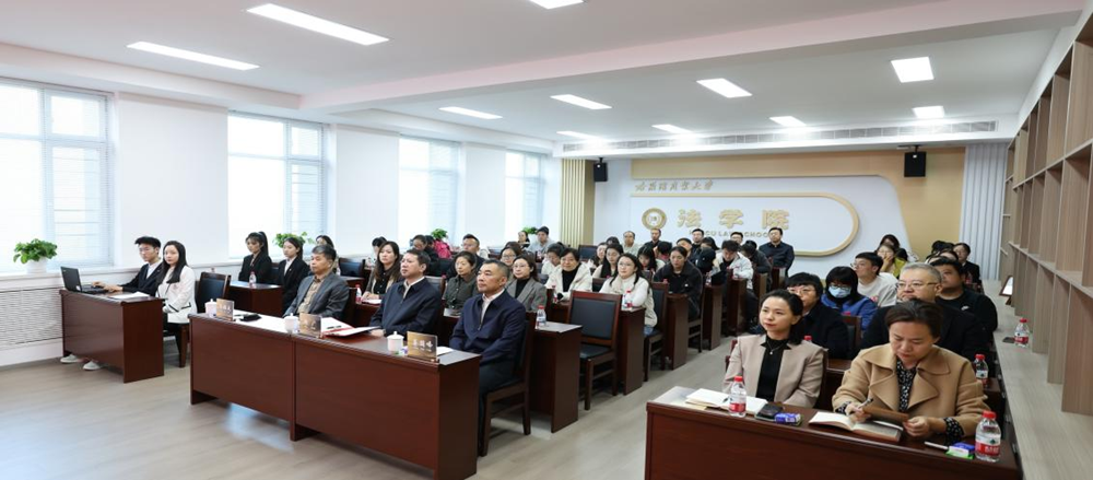 揭牌仪式后,王福友以《强化习近平法治思想的育人功能——思政课程的课程思政维度》为题作专题讲座。他指出,思政课程与其他课程一样具有知识性和思政性两个面向,既要从知识性面向讲深习近平法治思想的历史、理论和实践逻辑,更要深入研究并讲透习近平法治思想的思政面向,强化育人功能,讲清楚基于理论伟力的“大道理”,讲清楚契合商科专业特点的“中道理”,讲清楚助力学生成长的“小道理”。