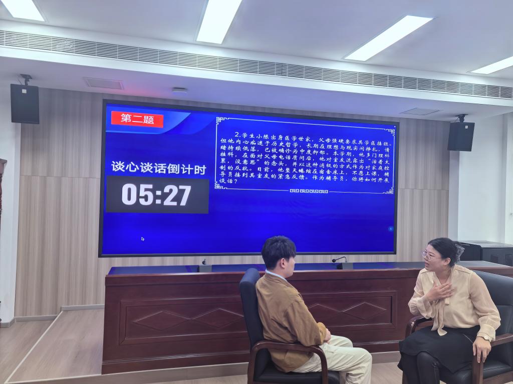 模拟演练过程中,参照案例分析和谈心谈话赛事流程,2025年校赛决赛晋级辅导员逐一进行抽题答题演练,于洋团队进行即时性、针对性的精准指导,在肯定亮点、特点的同时,指出优化方向,给予具体改进建议,切实帮助辅导员将日常工作积累转化为参赛实操能力,有效提升运用专业化方法开展学生工作的水平。