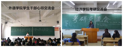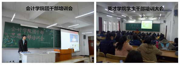 会计学院、英才学院、管理学院围绕“文明上网”、“社会主义核心价值观”、“开展社会实践和志愿活动”、“健康生活”、“弘扬美德”、“我的梦,中国梦”等热点问题,召开了团干部培训会、学生干部培训大会及以班级特色为主的团体活动。外语学院开展了以“激扬青春,展我学干风采”为主题的学生干部技能大赛以及“呵护心灵,健康成长”为主题的团活活动。
