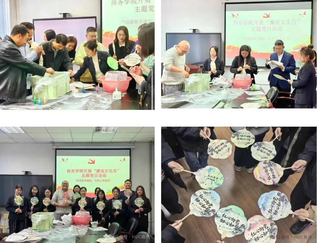 商务学院开展以“绘漆扇承廉韵 忆初心强党性”为主题的党日活动。商务学院全体党员首先学习了《中国共产党章程》《中国共产党廉洁自律准则》。而后,党员们共同观看漆扇制作教学视频并制作漆扇。大家精选色漆滴入水中,通过提、浸、吹、引等手法,让独特纹路附着扇面,每把漆扇纹理独一无二,师生在体验非遗魅力的同时,也将“清廉”二字深植于心。本次漆扇制作活动,是商务学院创新党建与廉洁教育形式的一次探索。它打破了传统纯理论学习的模式,以艺载道,以美育廉,让党性修养和廉洁自律的意识,如同扇面上那抹永不褪色的图案,深深烙印在每一位参与者的心中,营造出风清气正的校园文化氛围。