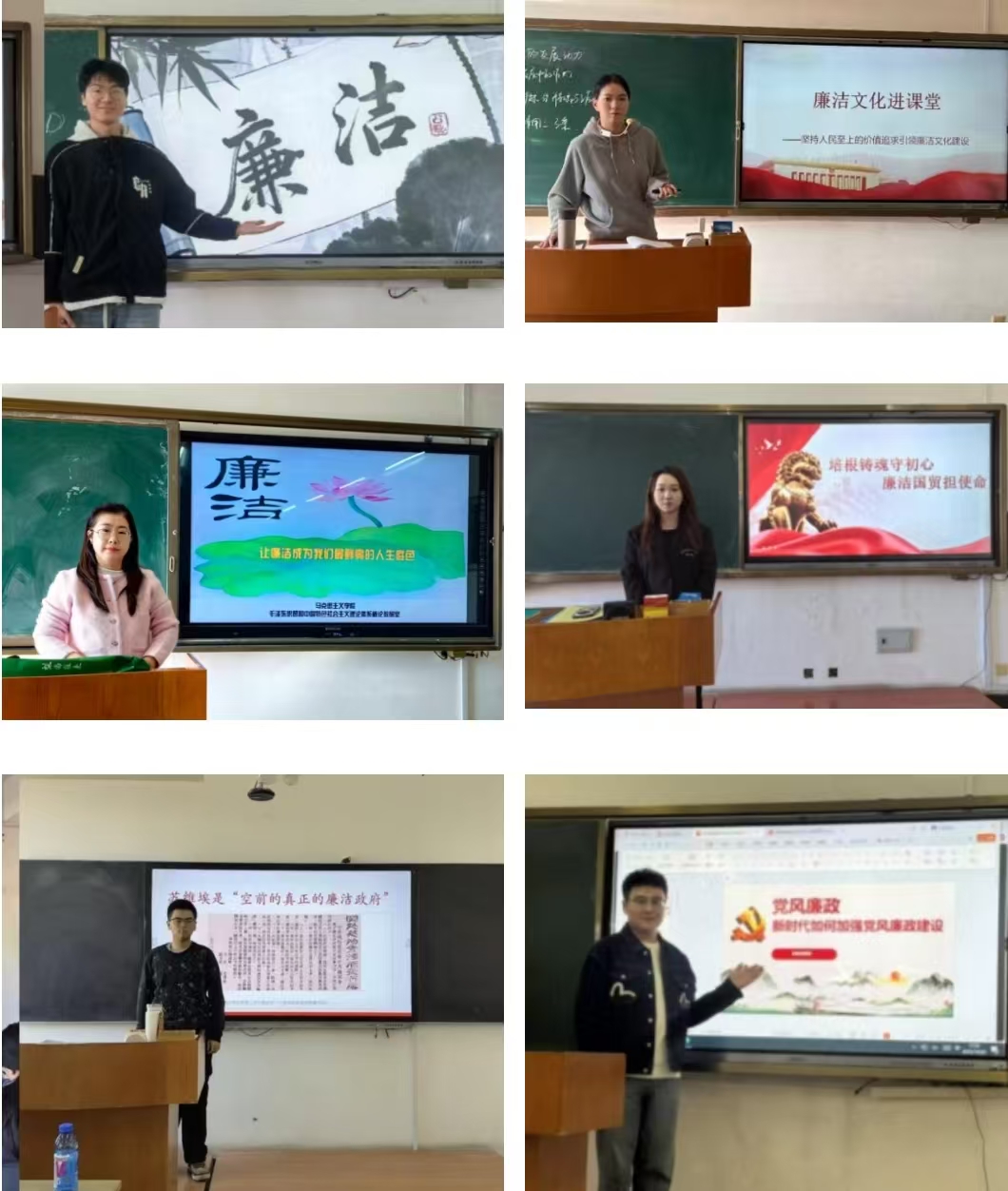 马克思主义学院扎实推进廉洁文化建设,与高校思想政治理论课教学深度融合,组织全体思政课教师结合课程内容、创新教学形式,将廉洁文化引进课堂教学,引导青年学生筑牢信仰之基、补足精神之钙、把稳思想之舵。习近平新时代中国特色社会主义思想概论课采用“历史—现实—理论”三位一体形式,将党的廉政文化有机融入第十章《建设社会主义文化强国》的教学实践。马克思主义基本原理教研室开展了以“坚持人民至上 做廉洁自律新青年”为主题的“廉洁文化进课堂”活动。将马克思主义世界观、人生观、价值观教育与廉政文化育人有机结合,深入挖掘教材中蕴含的廉政元素与人民立场。毛泽东思想和中国特色社会主义理论体系概论课开展了以“廉洁文化与青年担当”为主题的教学活动,围绕“诚信守法、勤俭节约、公正无私”等核心内容,通过案例剖析、互动讨论、情景模拟等多种形式,引导学生深入理解“清廉是福”的深刻内涵。思想道德与法治课教师采用“理论+案例”双轨教学法。系统讲解廉洁文化的历史渊源与核心要义,精选古今中外典型廉洁案例,用鲜活故事让廉洁教育更具感染力。中国近现代史纲要课将廉洁文化与中华民族优秀传统文化相结合,利用“课前5分钟”,组织同学们进行廉洁人物事迹讲述、廉洁故事小剧场、中华民族廉洁文化知识问答,将廉洁文化引进课堂。形势与政策教研室以“涵养清风正气,共谱廉洁新篇” 为主题,通过理论铸魂、案例警示、实践育人多重举措,筑牢师生廉洁思想防线,营造崇廉尚洁的育人氛围。