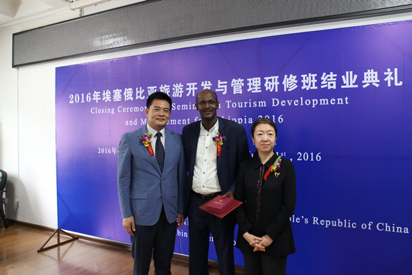 来埃塞俄比亚旅游组织的学员WOLDESILASSIE·ASHEBIRT代表学员发言,表达了对中国政府以及哈尔滨商业大学组织研修活动的感谢之情。最后,曾涛长和纪玫分别为每一位学员颁发了结业证书和礼物。