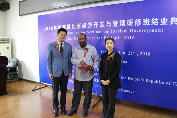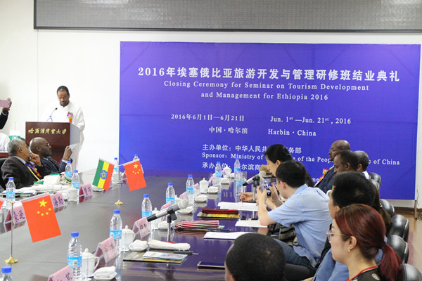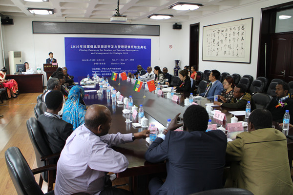 2016年6月21日上午,由哈尔滨商业大学承办的我国商务部人力资源援外项目埃塞俄比亚旅游开发与管理研修班的结业典礼在我校南校区主楼会议室隆重举行。本次研修活动的学员是来自埃塞俄比亚的二十位旅游业的官员和业务人员,他们已经圆满完成了在我校的研修任务,即将启程返回自己的国家。
