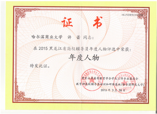 此项评选活动始于2008年,旨在深入贯彻中央16号文件精神,认真落实教育部24号令的相关要求,进一步加强高校辅导员队伍建设,宣传表彰一批长期以来在为人师表、爱岗敬业、无私奉献等方面有突出表现的优秀辅导员,发挥先进典型的引领和示范作用,更好地调动和激励高校辅导员工作的积极性和创造性,进一步推动高校辅导员队伍建设的新发展。“2015黑龙江省高校辅导员年度人物”评选活动开始后,我校领导高度重视,认真部署,有关职能部门积极动员、精心组织,在以往工作成绩突出的辅导员先进个人群体中,选拔推荐能源与建筑工程学院许蕾老师参选。经省教育厅组建的省内外专家评审组的初评、复评、终评三个环节的评审后,评选出了10名黑龙江省高校辅导员年度人物、10名黑龙江省高校辅导员年度人物提名奖、10名黑龙江省高校辅导员年度人物入围奖。