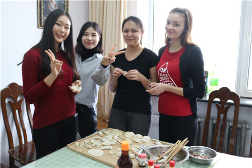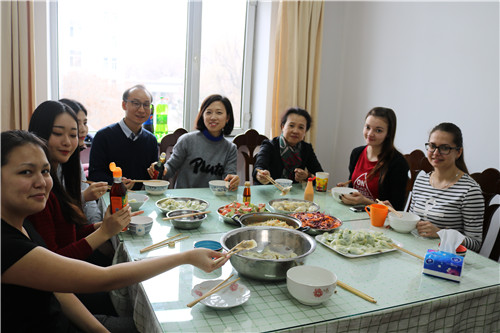 4月15日中午,我校国际教育学院三楼留学生餐厅春意浓浓,欢声不断。曹际燕书记正带领国际教育学院的老师们和来自俄罗斯、哈萨克斯坦、韩国的留学生们一起包饺子。