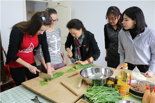 对于饺子,这些来自异国他乡的学生只在餐馆里吃过,从来没有亲手包过。为了让他们体验一下中国的饺子文化,品尝一下中国的传统美食,国际教育学院的老师买来了包饺子需要的各种食材和工具,手把手地教学生切菜、和馅、揉面、擀饺子皮儿,让学生了解包饺子的全部过程。曹际燕书记一边教学生包饺子,一边风趣幽默地向学生讲解了饺子的来历,还有关于饺子的有趣说法。比如“好吃不如饺子”,“打出来的媳妇、揉出来的面”,引得老师和学生一阵阵大笑。