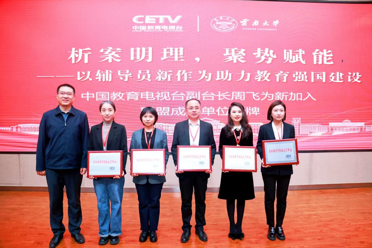 中国教育电视台高校辅导员联盟是由中国教育电视台在中宣部宣教局、教育部思政司指导下,于2019年发起成立的辅导员联盟组织。联盟以凝聚力量、资源共享、立德树人、价值引领为宗旨,聚焦全国高校辅导员队伍建设,搭建沟通交流平台,展示新时代高校辅导员风采,致力于构建思想政治工作全员、全过程、全方位育人的新格局。在此次会议上,中国教育电视台副台长周飞为15所新增的高校辅导员联盟成员单位授牌。我校学生工作部部长任婵媛参加授牌仪式。