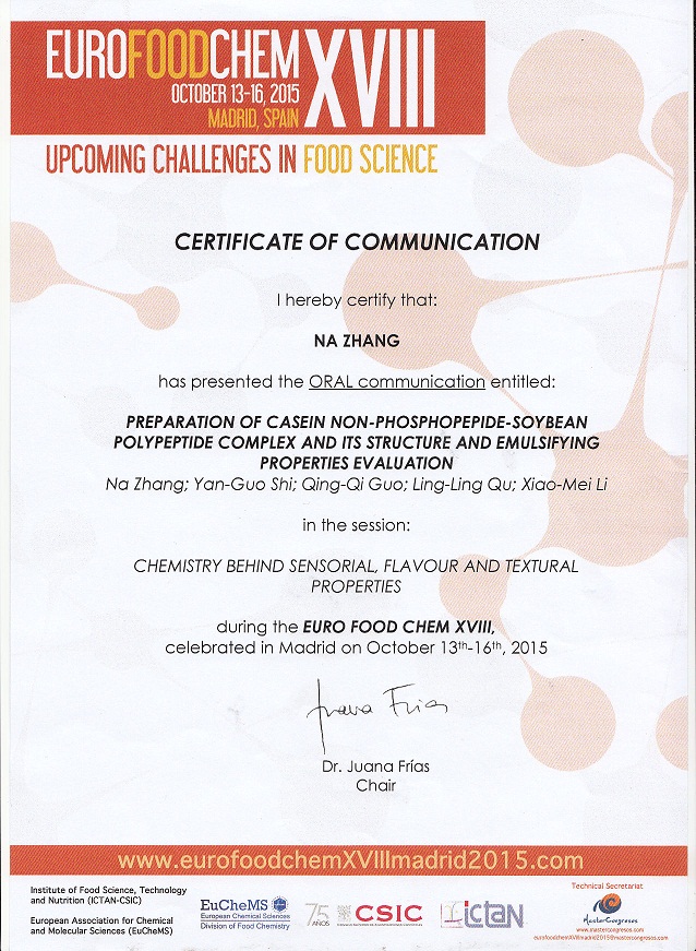 经第十八届欧洲食品化学会议会务组筛选,有24个大会主题报告、32个专题报告和383篇论文在会议中展示、交流。我校教师张娜成为众多亚洲参会人员中唯一的大会报告人。此次参会极大地提高了我校食品科学学科在国际上的知名度。
