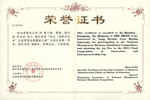 2015年全国管理决策模拟大赛全国总决赛于7月25-27日在上海第二工业大学举行。我校由2012级电子商务专业的郭强、2012级物流管理专业的徐千惠和2014级国贸专业的徐志强同学组成的代表队获得全国总决赛一等奖。