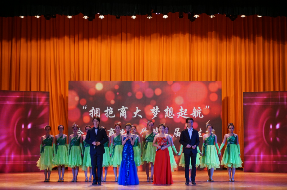 《岁月如歌》展现商大人在历史道路上奋力前行的脚印,话剧《梦》演绎出我们商大人的不凡梦想,舞蹈《Sunny》彰显我们商大人的生机活力,歌曲《最美的太阳》唱出商大人的青春热情,精彩的节目使得现场的欢呼声和掌声此起彼伏。主持人现场幽默风趣的问答互动,更是将现场气氛推向高潮,晚会现场充满快乐和喜悦。最终,晚会在一支优美的主题舞蹈《商大人》中走进尾声。
