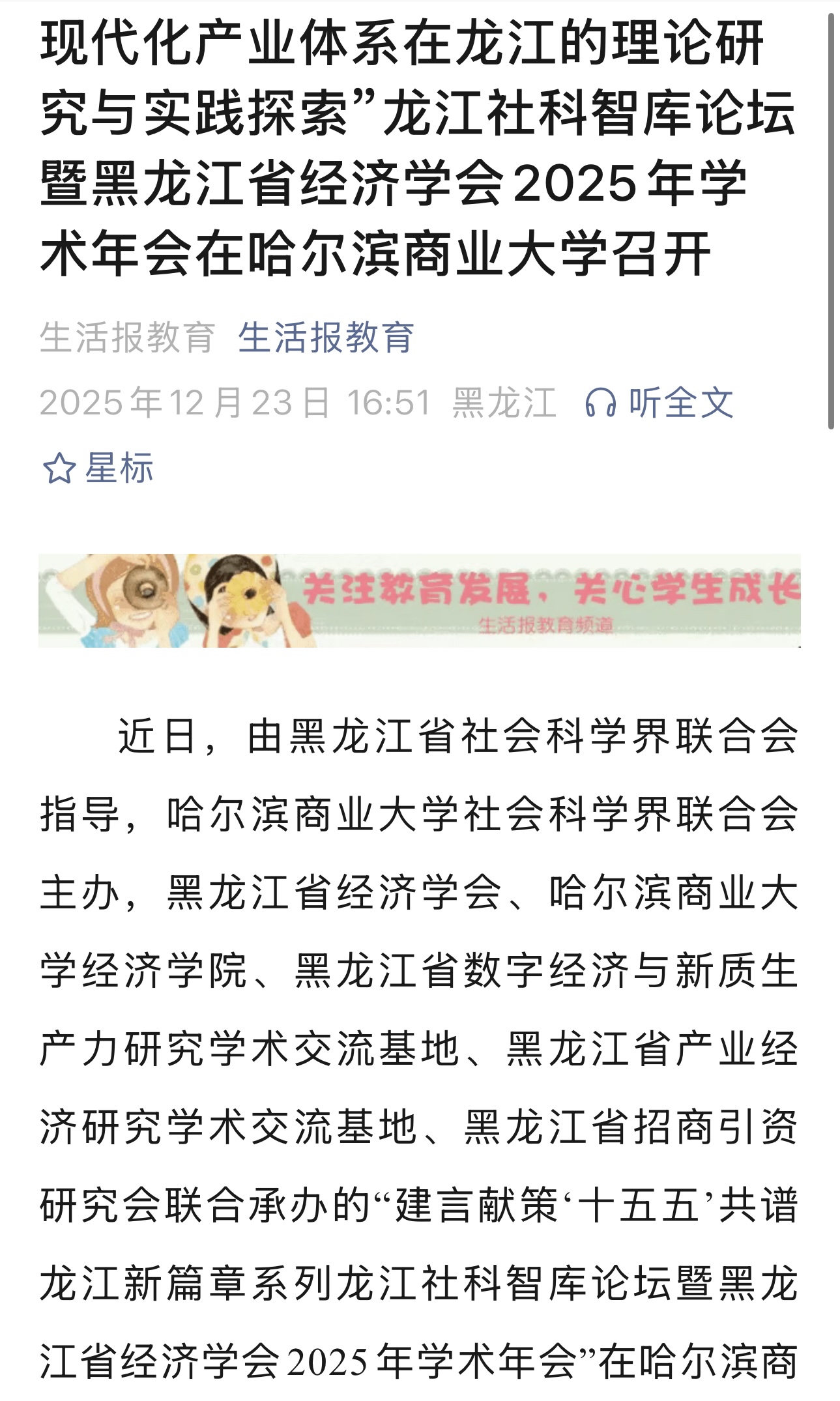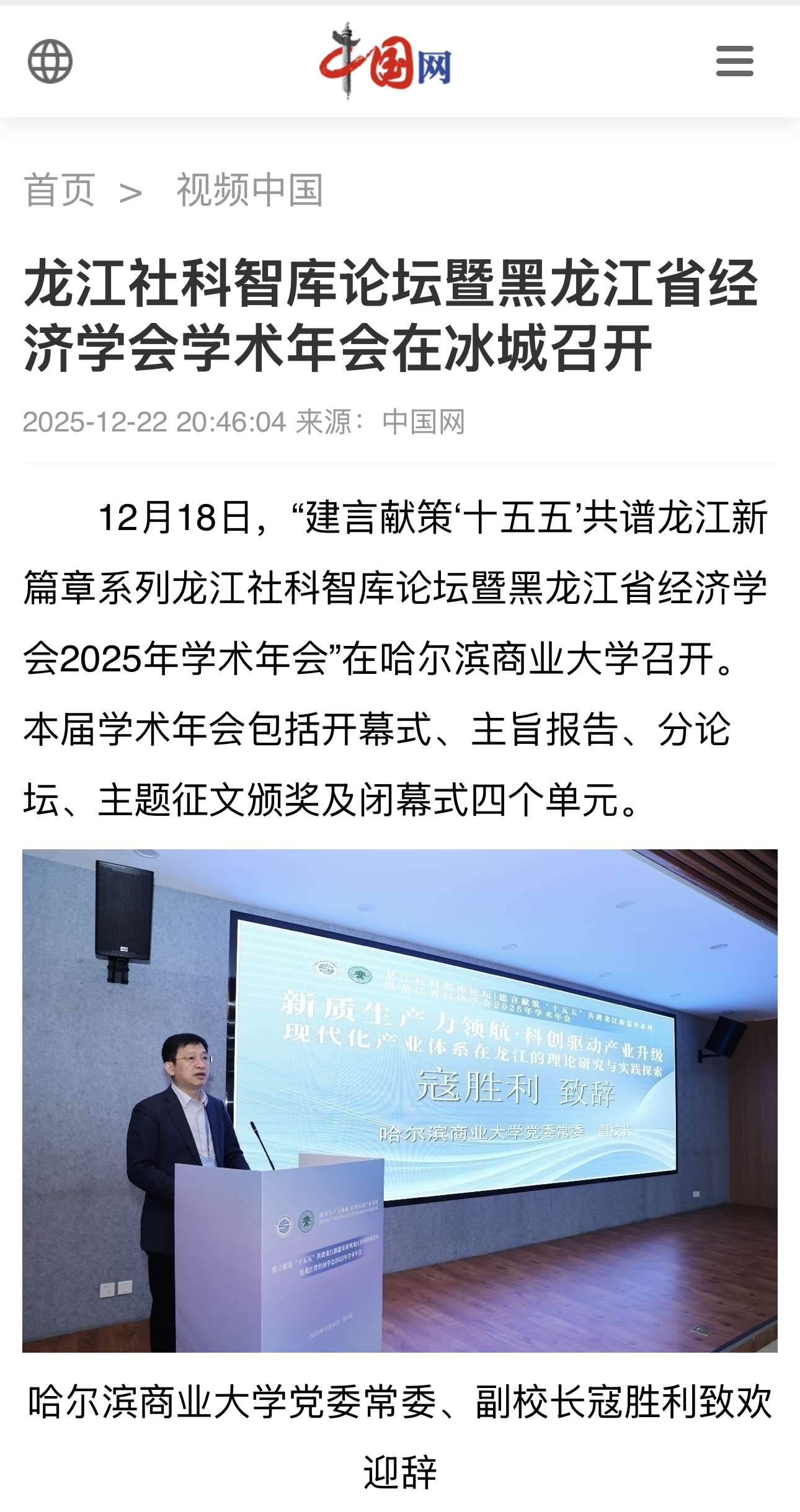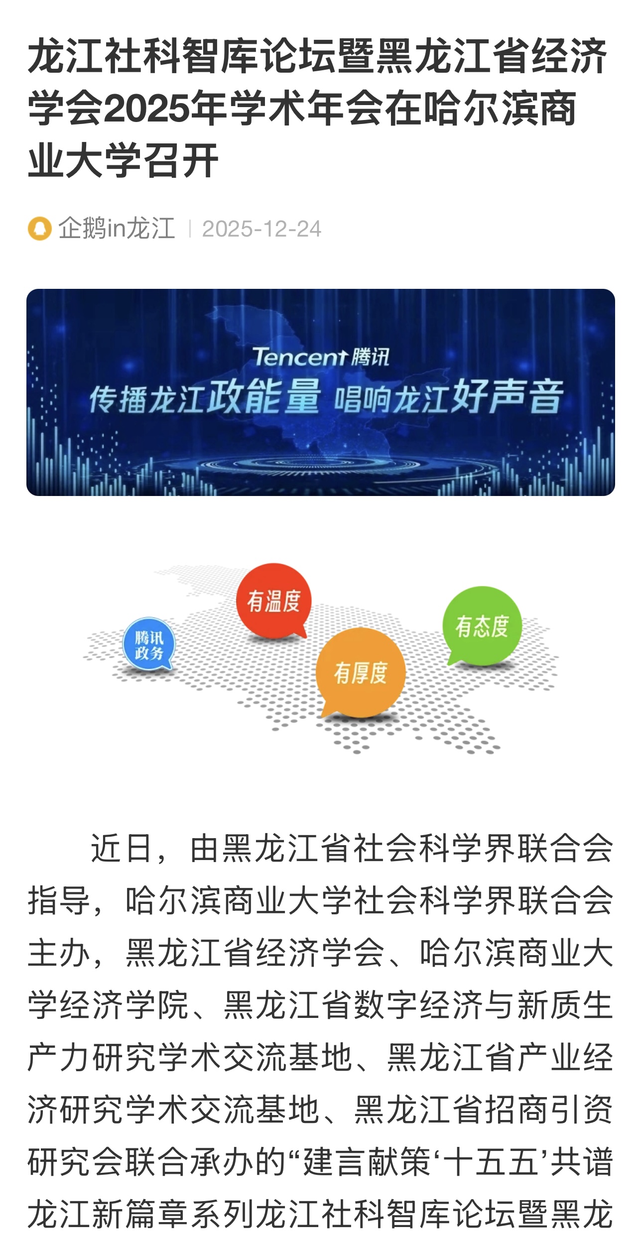 近日,由黑龙江省社会科学界联合会指导,我校社会科学界联合会主办,黑龙江省经济学会、我校经济学院、黑龙江省数字经济与新质生产力研究学术交流基地、黑龙江省产业经济研究学术交流基地、黑龙江省招商引资研究会联合承办的“建言献策‘十五五’共谱龙江新篇章系列龙江社科智库论坛暨黑龙江省经济学会2025年学术年会”在我校召开。本届学术年会主题为:“新质生产力领航·科创驱动产业升级——现代化产业体系在龙江的理论研究与实践探索”。论坛开展情况受到中国网、中国社会科学报、中国教育在线、东北网、生活报、腾讯新闻等多家媒体关注报道。