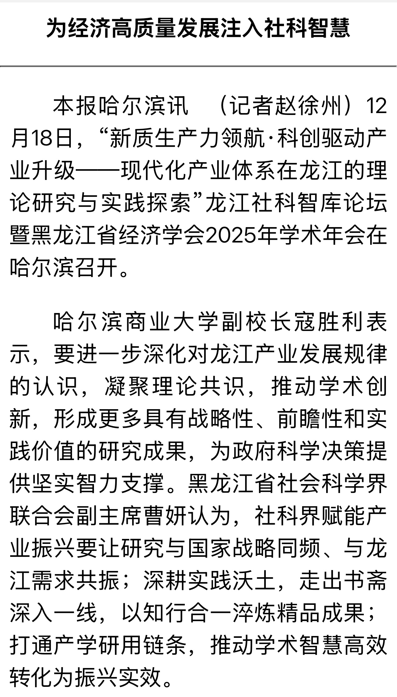 点击查看原文:“新质生产力领航·科创驱动产业升级——现代化产业体系在龙江的理论研究与实践探索”龙江社科智库论坛暨黑龙江省经济学会2025年学术年会在哈尔滨商业大学召开
