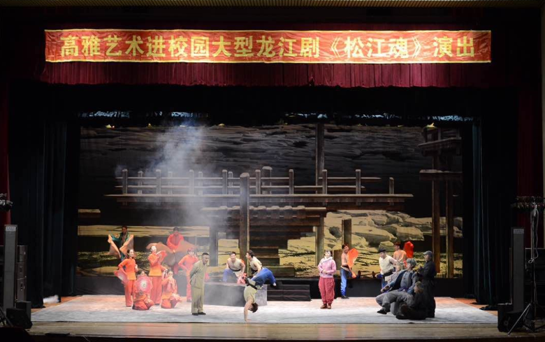 《松江魂》作为高雅艺术进校园活动剧目首次在我校演出,该剧目演绎了生活在松花江边的草根艺人与底层民众在国耻民辱的生死关头,奋起抗争、舍生取义、共赴国难的故事。是一部弘扬民族精神,提振国民气节的主旋律作品。作为黑土地域特色浓郁,主题立意积极向上的家乡戏,不但展示了我省独具特色的历史文化和风土人情,更展示了龙江人民的大义、大爱情怀。为打造具有国家级水准的艺术精品,龙江剧艺术中心聘请了国内一流的导演、舞美设计师和服装设计师,使该剧更具色彩绚丽、大气壮美的视觉和听觉冲击力,颇具可看性和艺术欣赏性。此次《松江魂》走进我校,更加引导我校学生弘扬优秀民族文化,提高艺术和文化素养,拓宽文化视野。