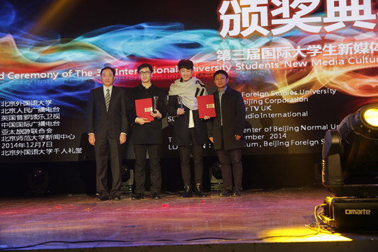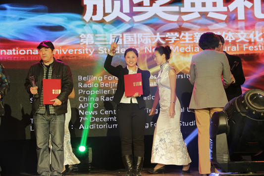 12月7日,第三届国际大学生新媒体文化节暨“我眼中的中国”颁奖典礼在北京外国语大学盛大举行,我校学生网络代表台受邀出席颁奖典礼。本届新媒体文化节共征集来自全国近130所高校的1200余部作品。比赛通过决赛答辩等环节评出各大奖项,我台在本届大学生新媒体文化节上收获颇多。其中,张冰老师获得“优秀指导老师奖”,前副台长鸿毅同学凭借作品《怒放的生命》蝉联新媒体单项奖“最佳男演员奖”,《我与哈尔滨》栏目获“优秀校园栏目奖”,张诗宇同学作品《相信自己无限极》获优秀奖。