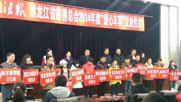 我校学生资助服务中心为了减轻特困学生买车票的经济负担,于近日为2014级特困学生每人资助200元车票补助款,共计五万余元,全校267名2014级特困学生受到此项爱心资助。与此同时,由黑龙江省慈善总会和生活报联合捐助我校20名省内外学生的“爱心车票”款也发放到学生手中。他们将拿着满载爱心、关心的车票踏上回家的旅途。