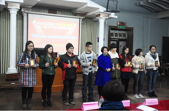 英语辩论赛分为两种:初赛赛制为三分钟即兴演讲,为复赛质量提高起到很大作用;复赛、决赛赛制则采用英国议会制,极大地激发了同学们的参观、参与热情,比赛选手分为A、B、C、D 4个小组,每组正反双方各四人。辩论话题切合时代,且具有深刻意义。在全场比赛结束之后,评委老师上台点评,对同学们的表现给予了高度肯定,并对存在的不足给予建议,使选手的英语技能、辩论水平得到提升。