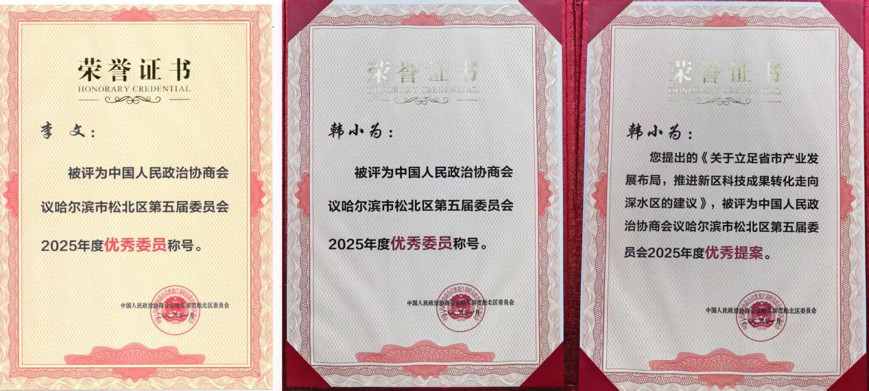 我校人大代表、政协委员还参加了哈尔滨市道里区第十七届人民代表大会第六次会议、中国人民政治协商会议哈尔滨市道里区第十五届委员会第五次会议、哈尔滨市松北区第五届人民代表大会第五次会议、中国人民政治协商会议哈尔滨市松北区第五届委员会第五次会议,围绕民生保障、公共服务、交通优化等领域,聚焦民生痛点,提出提案议案18项。李文、韩小为荣获优秀政协委员称号,韩小为提交的《关于立足省市产业发展布局,推进新区科技成果转化走向深水区的建议》荣获优秀提案。此外,李文以《推动人工智能教育先行区迈向示范区,持续赋能新区教育高质量发展》为题作大会发言。