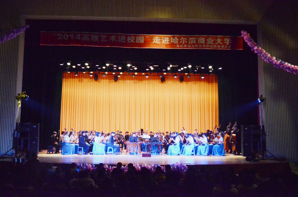 由教育部、文化部、财政部联合举办的“2014年高雅艺术进校园 ”走进哈尔滨商业大学——东北农业大学艺术学院民族专场音乐会于11月7日在B区大礼堂隆重举行。怀揣着对高雅艺术的无限向往与期待,我校学生早早步入礼堂,近600人走进音乐的殿堂,感受艺术的魅力。