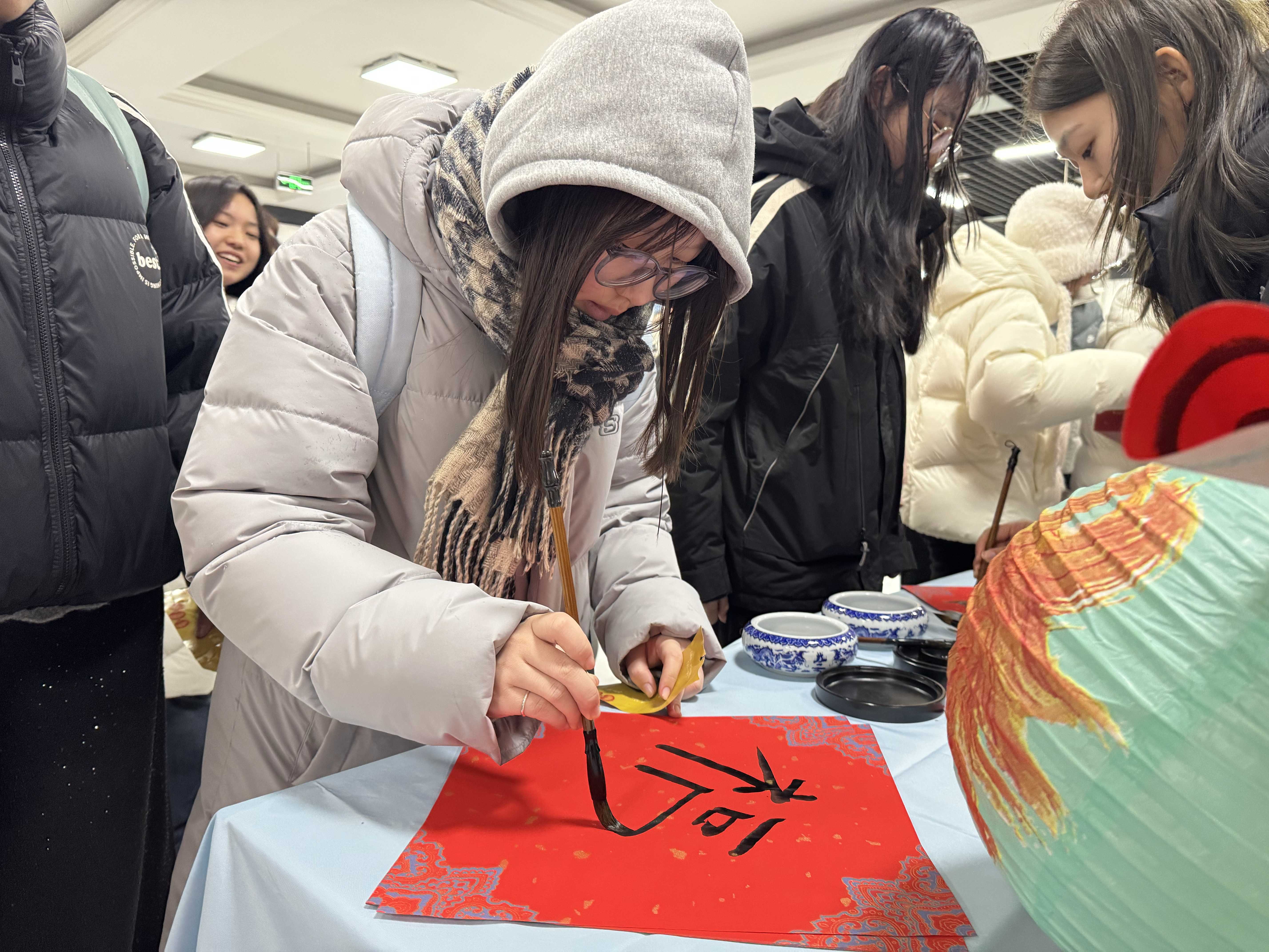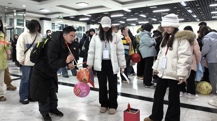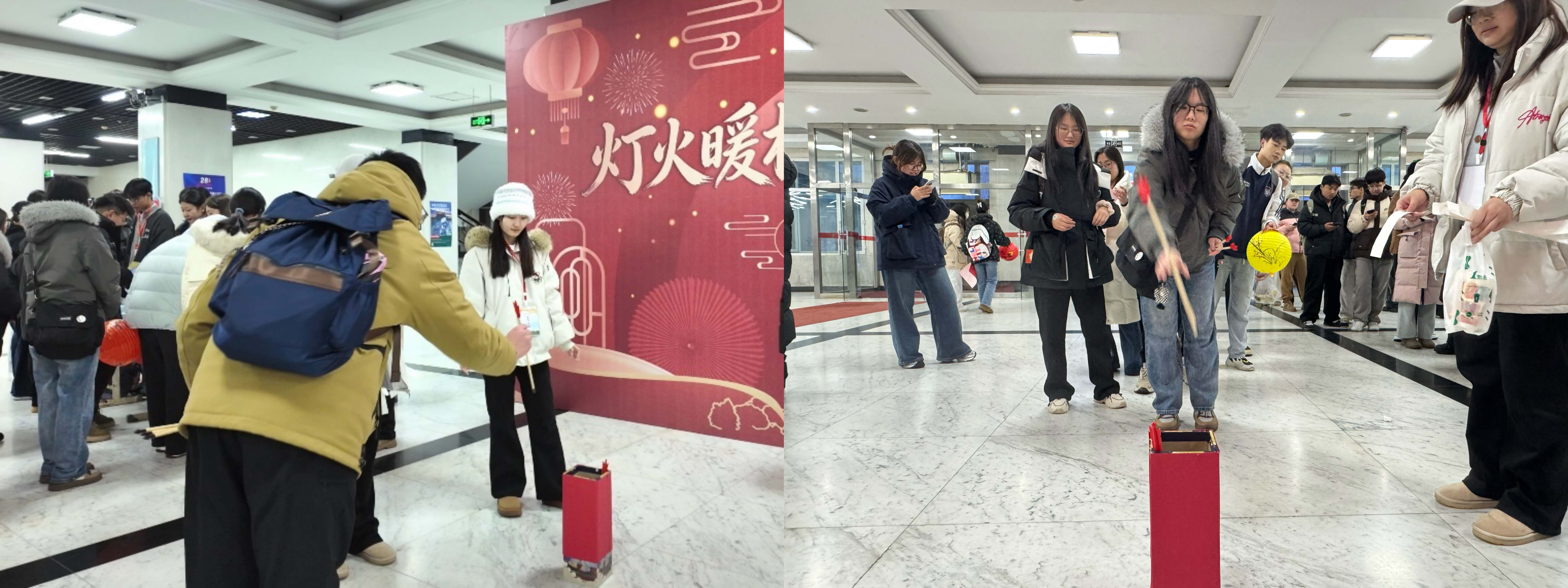 民俗雅集三重闯关,让传统年味触手可及。雅戏投壶前,同学们凝神聚力、抬手投矢,在一投一掷间体验传统游艺的魅力,木箭划过空气的轻响、入壶时清脆的撞击、同伴们的加油声——这一刻,千年前的投壶之乐,在校园的灯火下鲜活重现。