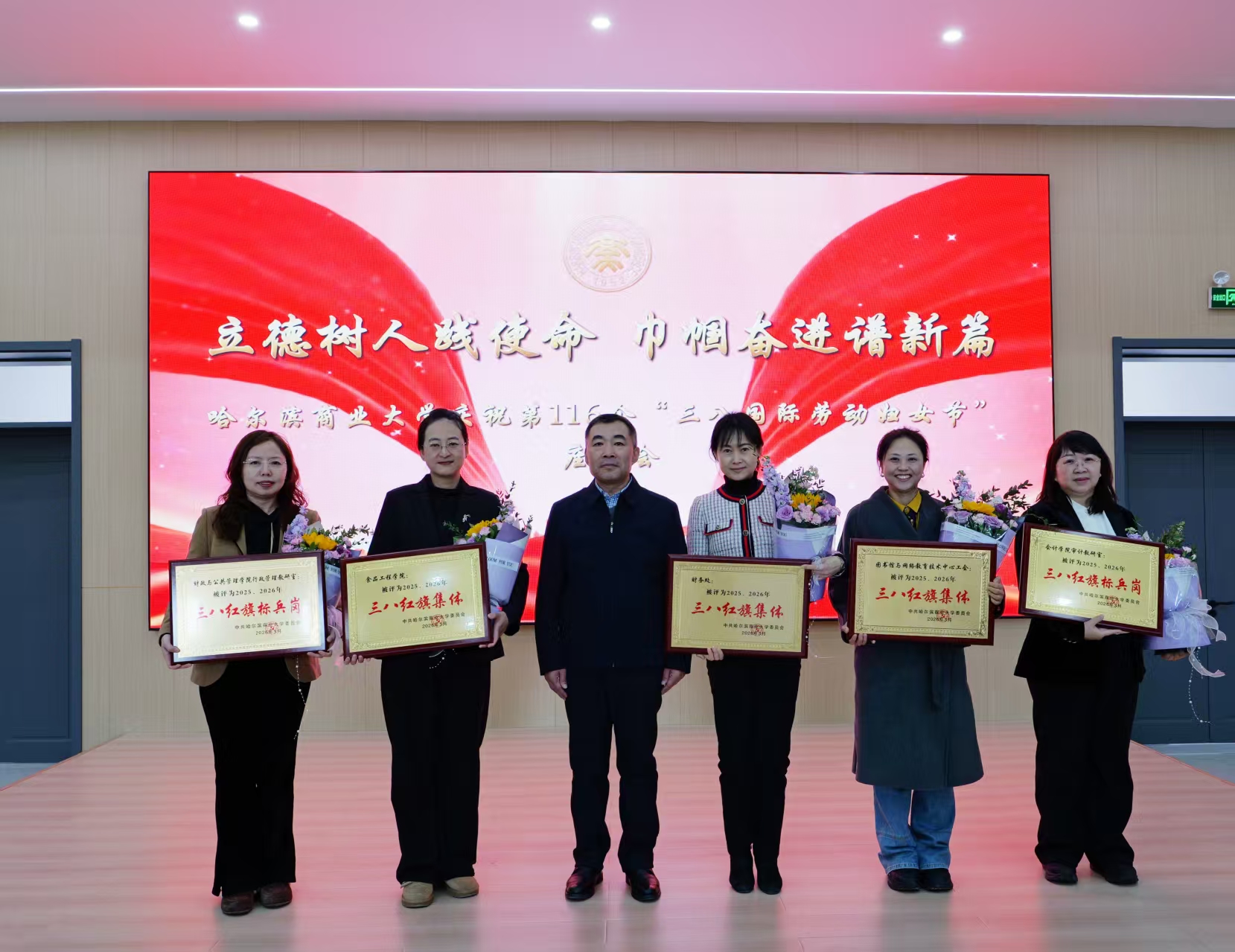 会议对2025、2026年“三八”红旗集体(标兵岗)、杰出巾帼工作者进行了表彰,校领导为获奖集体和个人颁发荣誉奖牌和证书,向全校广大女教职工致以节日的美好祝福和诚挚问候,并充分肯定了全校女教职工在教学科研、人才培养、管理服务、校园建设等各项工作中发挥的重要作用、作出的突出贡献。长期以来,我校广大女教职工以高度的责任感和使命感,立足本职、深耕细作,敬业奉献、锐意进取,以巾帼不让须眉的昂扬姿态,在立德树人一线坚守初心,在事业发展征程中勇毅前行,生动展现了新时代商大女性自尊自信、自立自强的精神风貌,为学校高质量发展撑起了“半边天”。