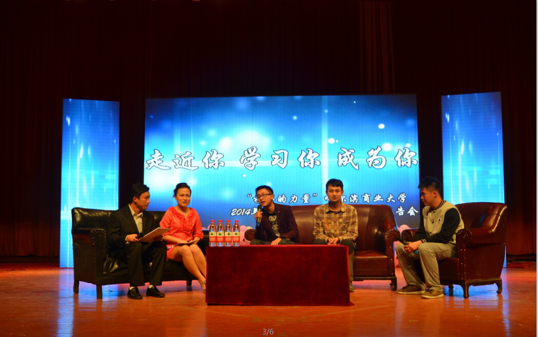 作为我校“拥抱商大、梦想起航”第二届新生节系列活动,“榜样的力量”优秀学生先进事迹报告会是校团委为发挥共青团思想引领与成长服务职能而开展的典型示范教育活动。旨在为突出典型引领教育,凸显榜样力量,让2014级新生从学校榜样人物事迹中受益。报告会由视频、图片、音频等多种媒介采用立体的形式深入挖掘,校团委从我校近年来共青团“五四”评优表彰及“一二九”年度学生人物评选表彰中涌现出的学生典型中选取了在全面发展、勤奋学习、科技创新等学习方面的典型人物及集体作为受访对象。其中包括以全校第一名的成绩考入我校研究生,曾任我校校团委学生副书记的孙溪泽;专业创新实践典型——孙静怡;英才学院2012级工商管理类2班团支部;我校原创校园励志剧《春天的礼物》剧组;我校优秀志愿服务、爱心传递的典范——“馨苑助学”协会;创新创业新型社团——校大学生创业联合会。孙溪泽作为我校的优秀毕业生代表,在2011年离校后,通过努力已经做到万科集团中层管理岗位,并在短短几年工资、奖金、投资共计收入80余万元。在报告会上他向学弟、学妹们分享了成功的秘密:要为理想实现确定目标清单,沉下去、坚持住、浮上来,永怀梦想和激情,熬得住才有收获,四句话引起全场同学的共同诵读和强烈共鸣;孙静怡,以自己的努力和坚持获得我校保送研究生的资格,并成为我校唯一一个去天津参加“中国食品包装学术会议”的学生;英才学院2012级工商管理类一班团支部,全班同学的平均分达到90分以上,四、六级过级率都为英才学院第一;我校原创校园励志剧《春天的礼物》剧组,不辞辛劳经历连续3个多月的艰苦训练,为全省高校带来一场感人挚切的文化盛宴;校大学生创业联合会作为我校新成立的创新创业型社团,他们用自身经历向在场的1000余名新生诉说着科技铸就梦想,坚持创造辉煌。报告会期间掌声不断,会充分展现了学生榜样们奋发向上的青春风貌以及勤奋学习、善于思考、不断进取、勇往直前的可贵品质。