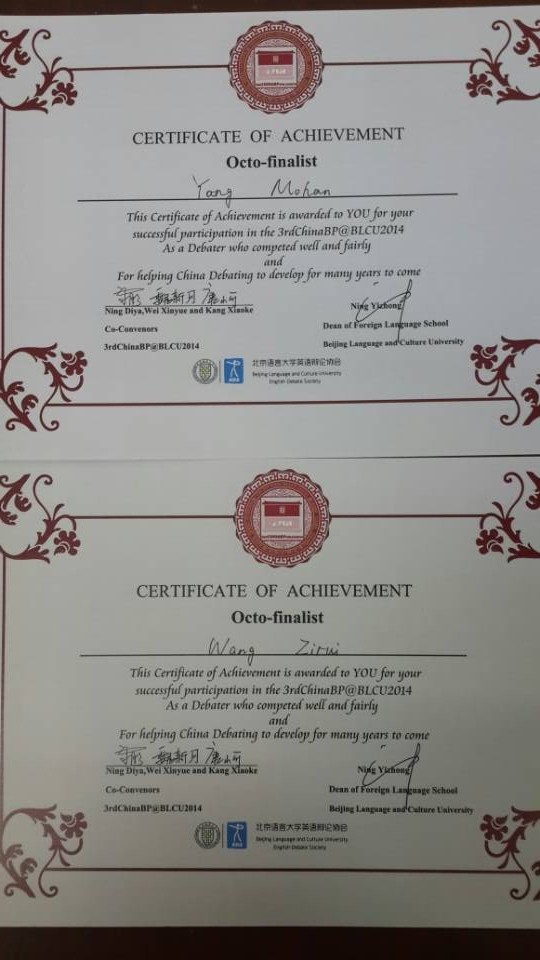 中国英式议会制辩论赛(CHINA British Parliamentary Debate Competition)是由新加坡辩论联盟主席Loke Wing Fatt先生发起的代表亚洲最高水平的国际性大学生辩论赛。今年9月5日在号称“小联合国”的北京语言大学举行了第三届中国英式议会制辩论赛(China BP)。比赛分四天进行,参赛队伍共120支,分别由来自中国、日本、韩国、新加坡、马来西亚、泰国等国家的240名顶尖高手组成。由我校外语学院刘春阳老师指导的英才学院杨默涵同学及药学院王子瑞同学,以今年中国辩论大师赛季军的身份获得了China BP参赛资格,这也是我校首次获得参加国际赛事的资格。在比赛过程中,选手们围绕着国际关系、女性权益、经济发展、宗教、文化等主题展开了知识与思维的头脑风暴。经过九轮初赛的比拼,战胜了来自首尔中央大学、早稻田大学、东京大学、新加坡国立大学、香港大学、澳门大学、复旦大学、清华大学、北京外国语大学等高校的选手,成功杀入八分之一决赛。本次比赛只有五支中国队伍出线,我校是东北地区唯一出线的高校。同时,此次比赛的优异成绩使得我校获得了今年十一月在台湾举行的东北亚辩论公开赛(NEAO)的参赛资格。