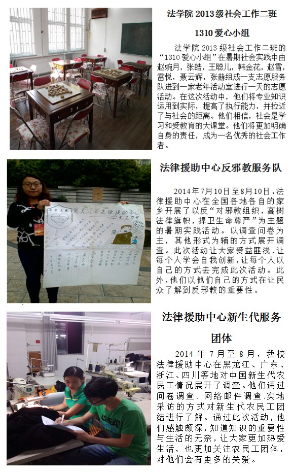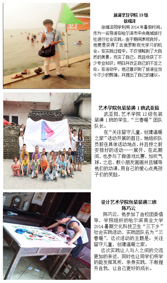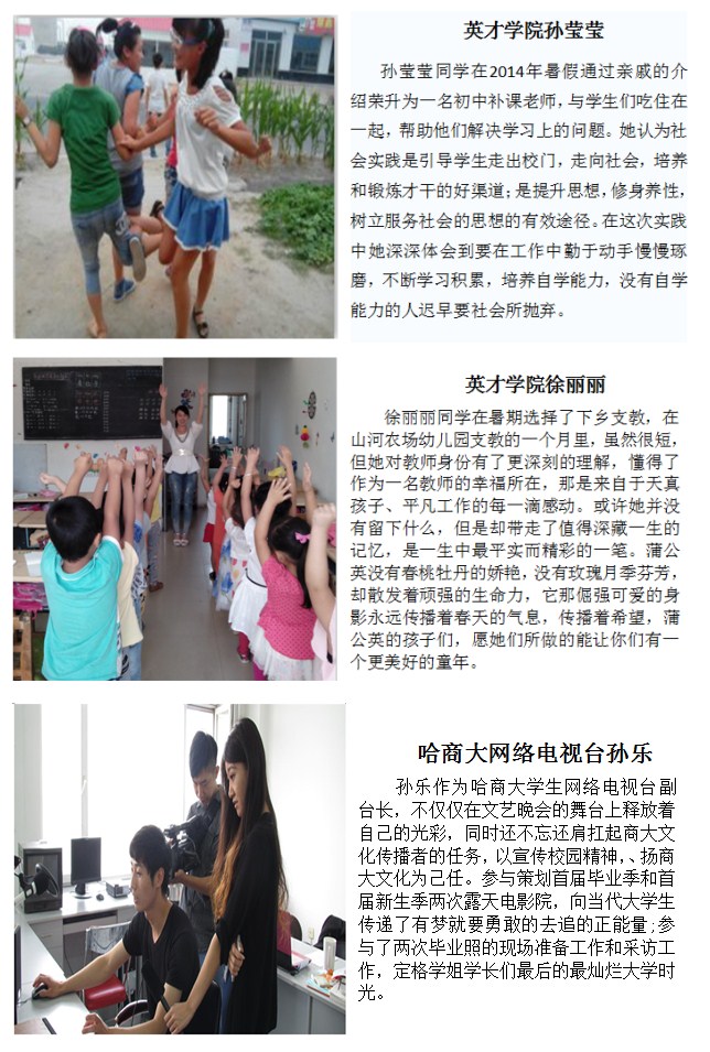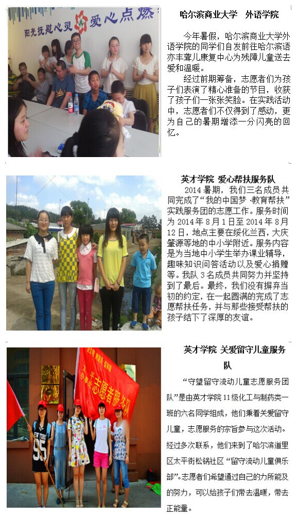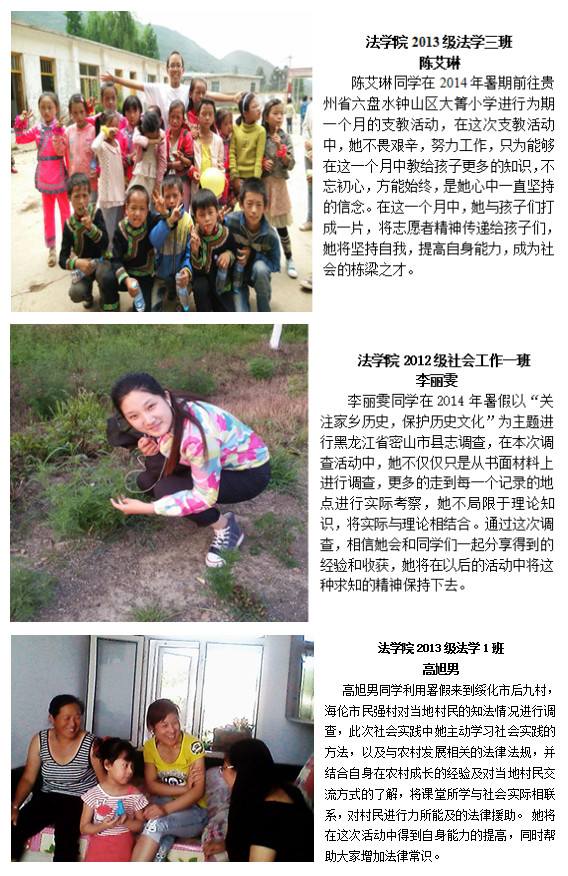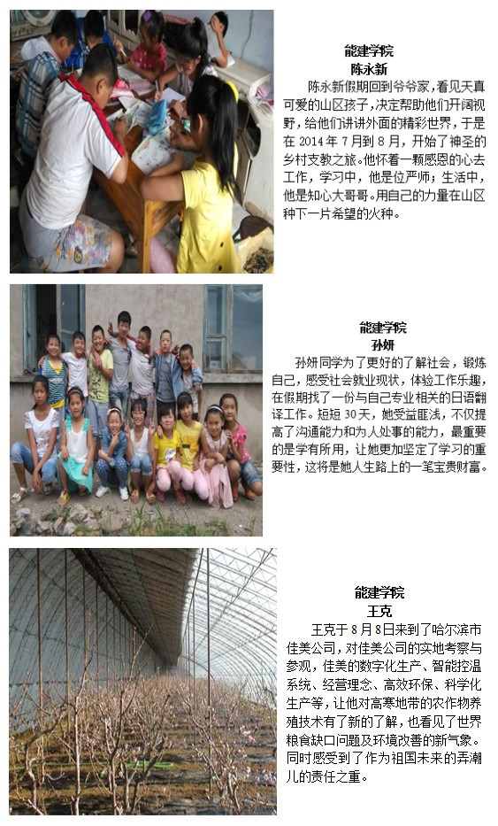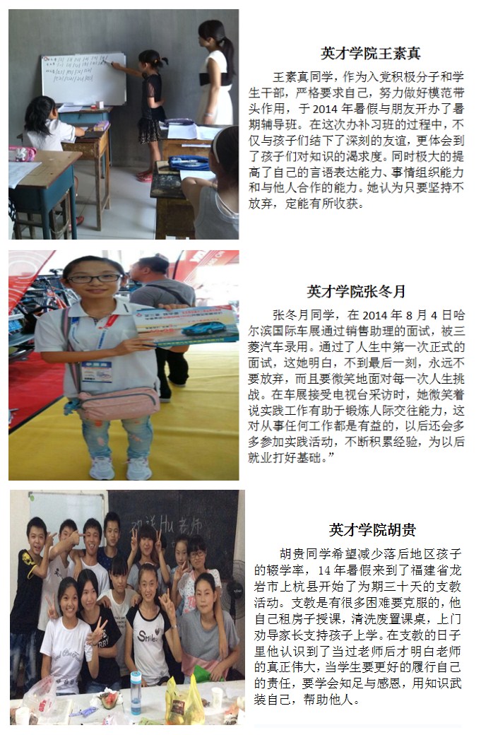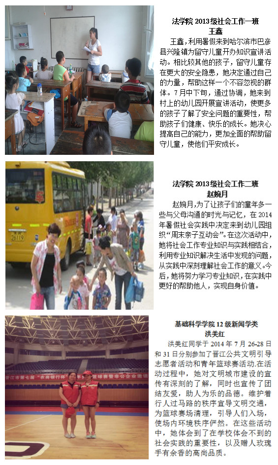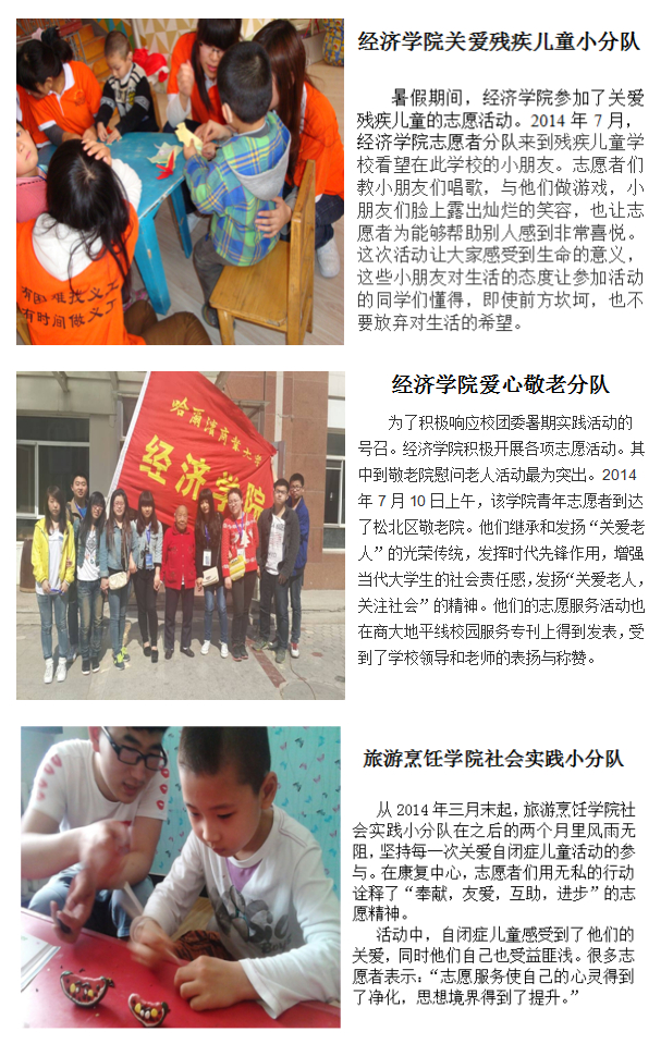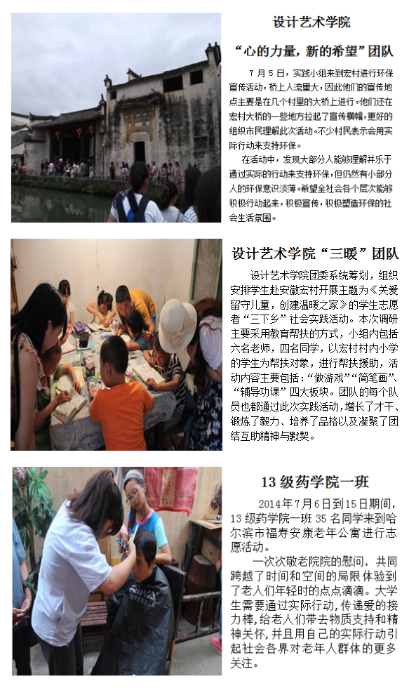 在我校团委组织开展以“实践激扬青春志,奋斗成就中国梦”为主题的暑期社会实践活动以来, 全校各学院团委、校级学生组织、各类学生社团以及班级支部纷纷响应学校号召,利用假期围绕公益服务、教育帮扶、科技兴农、社会调查、帮孤助残、文明宣讲等实践形式精心设计、组织、开展了形式多样、内容丰富的实践活动。全校近60个实践团队、近百名学生个人向学校团委上交了详实、生动的实践报告汇报实践活动。一个月来,其活动足迹覆盖十余个省份,50余城镇,其身影活跃在城市及乡村、遍及繁华与僻远。并在实践中开拓了视野,增长了才干,认清了责任。