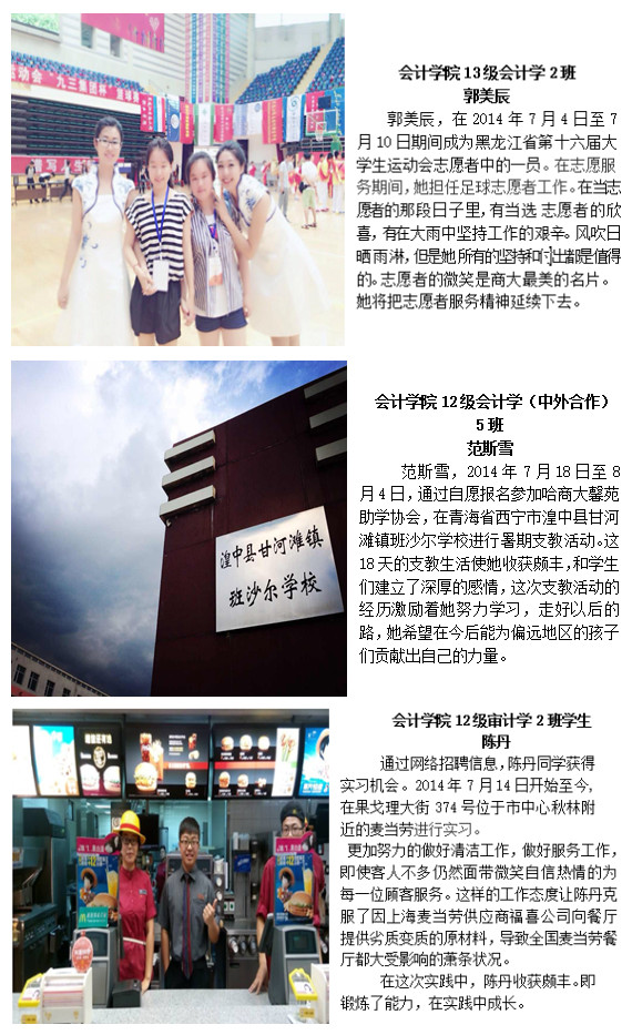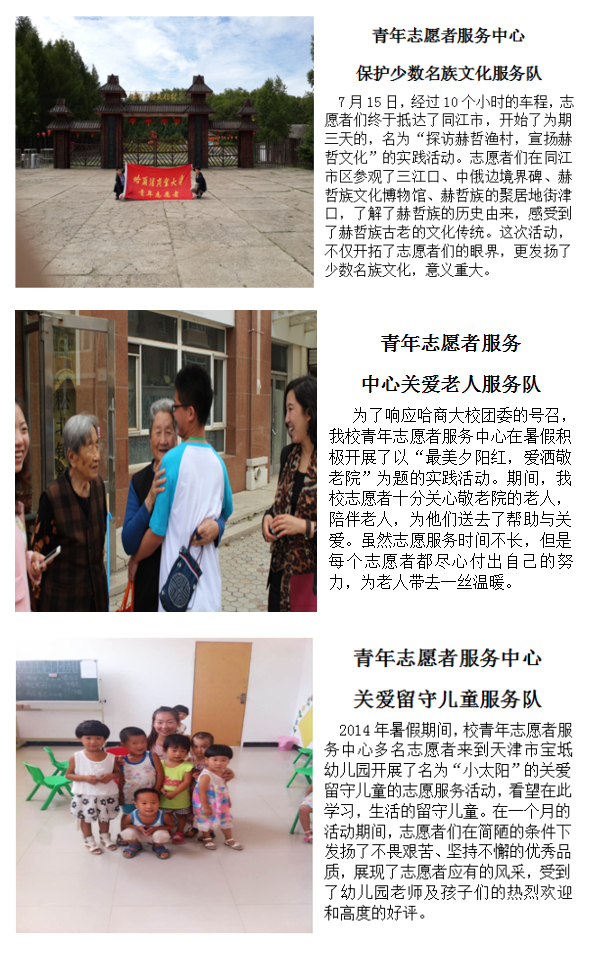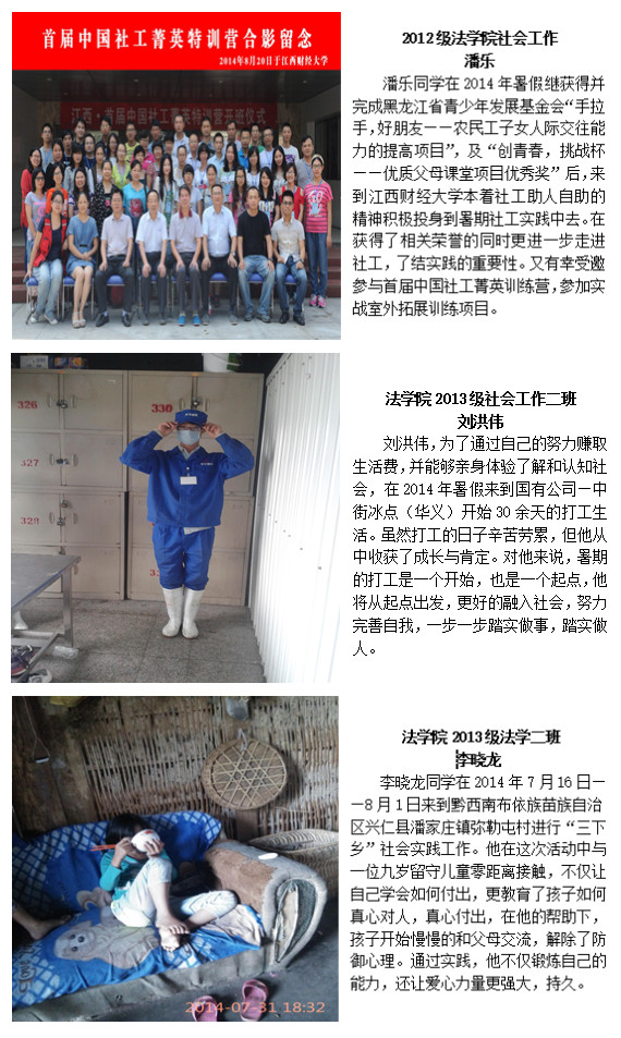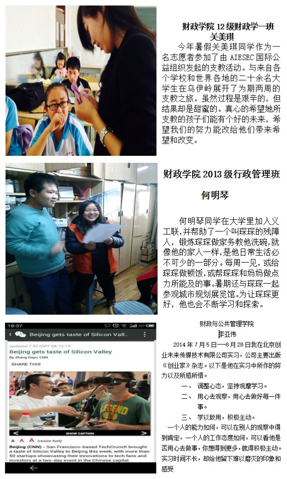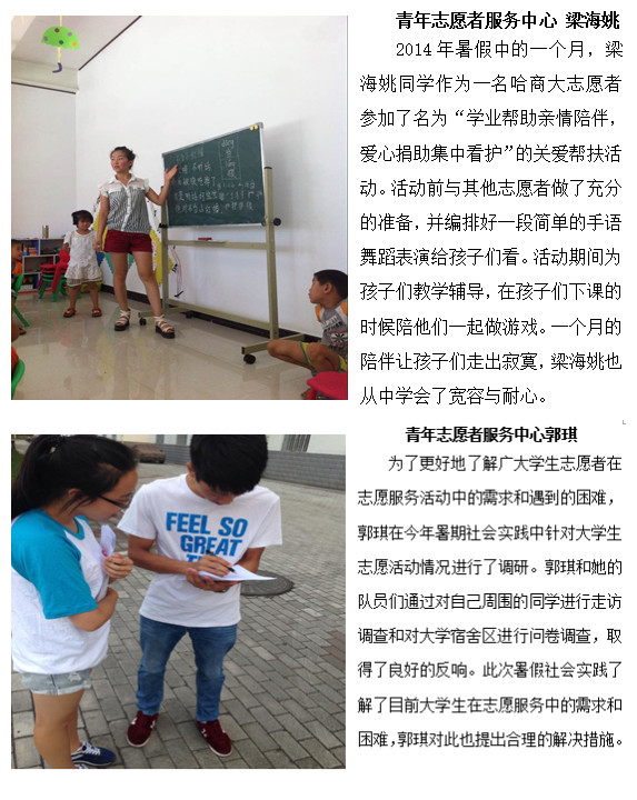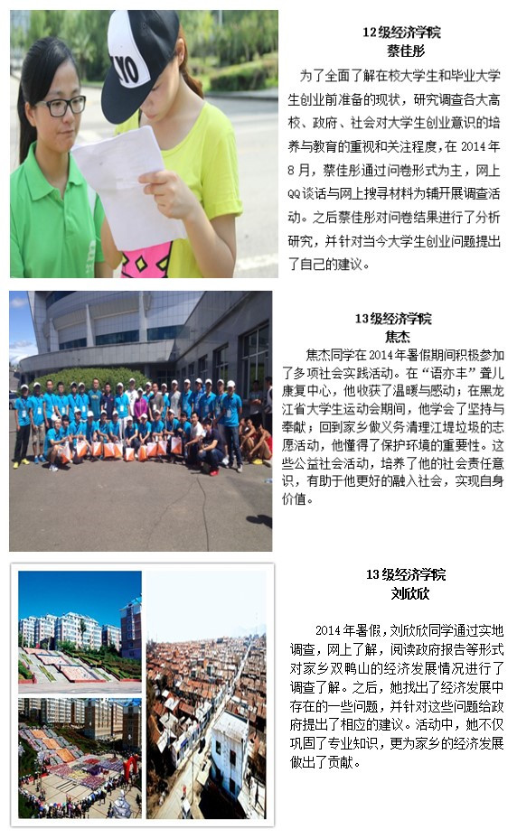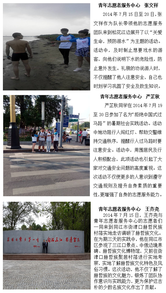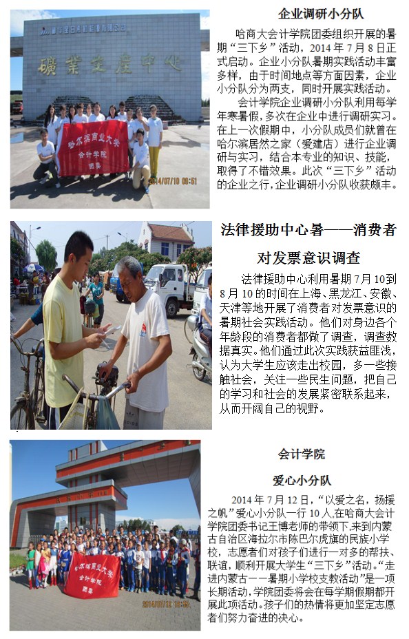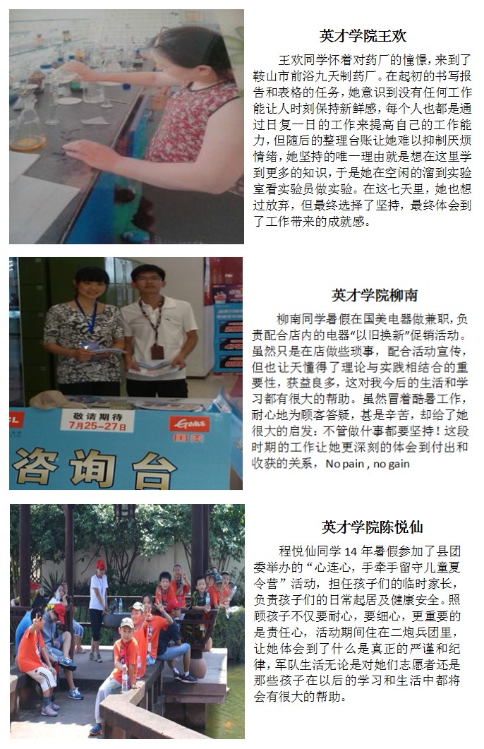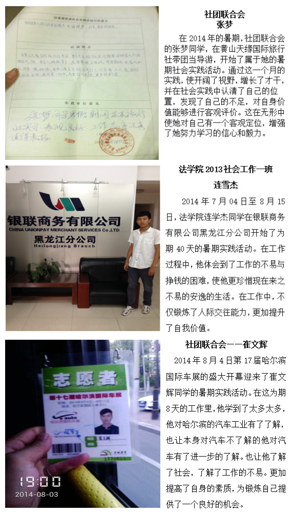 在我校团委组织开展以“实践激扬青春志,奋斗成就中国梦”为主题的暑期社会实践活动以来, 全校各学院团委、校级学生组织、各类学生社团以及班级支部纷纷响应学校号召,利用假期围绕公益服务、教育帮扶、科技兴农、社会调查、帮孤助残、文明宣讲等实践形式精心设计、组织、开展了形式多样、内容丰富的实践活动。全校近60个实践团队、近百名学生个人向学校团委上交了详实、生动的实践报告汇报实践活动。一个月来,其活动足迹覆盖十余个省份,50余城镇,其身影活跃在城市及乡村、遍及繁华与僻远。并在实践中开拓了视野,增长了才干,认清了责任。