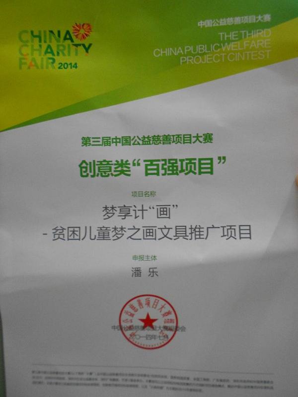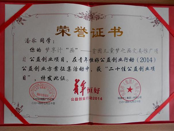 我校法学院2012级社会工作专业学生潘乐的公益项目“梦享计‘画’——贫困儿童梦之画文具推广项目”连创佳绩,继6月份荣获星光行动资助后,在全国五百多个公益项目中脱颖而出,被评为“2014青年恒好公益创业行动二十佳公益项目”。潘乐同学7月末受邀赴京参加了青年恒好公益创业行动青年成果发布会,并在成果发布会上作为二十佳代表发言,分享了专业实践中的公益心得。同时,在第三届“中国公益慈善项目大赛”中,该项目又斩获佳绩,从来自全国各地906份项目中突围,荣获“创意类百强项目”。
