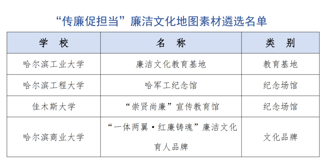据悉,第十届全国高校廉洁教育系列活动由教育部办公厅部署开展,以“清风育德守初心 廉洁笃行担使命”为主题,经自主申报、各省教育厅审核把关及专家评审,共遴选出“传廉促担当”廉洁文化地图素材242件。我校“一体两翼·红廉铸魂”廉洁文化育人品牌结合龙江“五色”教育,持续深化社会主义核心价值观宣传教育,探索实施以思想政治工作为主体、以红色文化弘扬和诚信文化建设为两翼的“一体两翼”文化育人工作模式。在廉洁文化建设中以“红廉铸魂”为核心,深挖各类课程中的红廉文化资源“富矿”,丰富教育形式,拓宽育人载体,引导全校师生共同营造廉洁公正的教风学风。