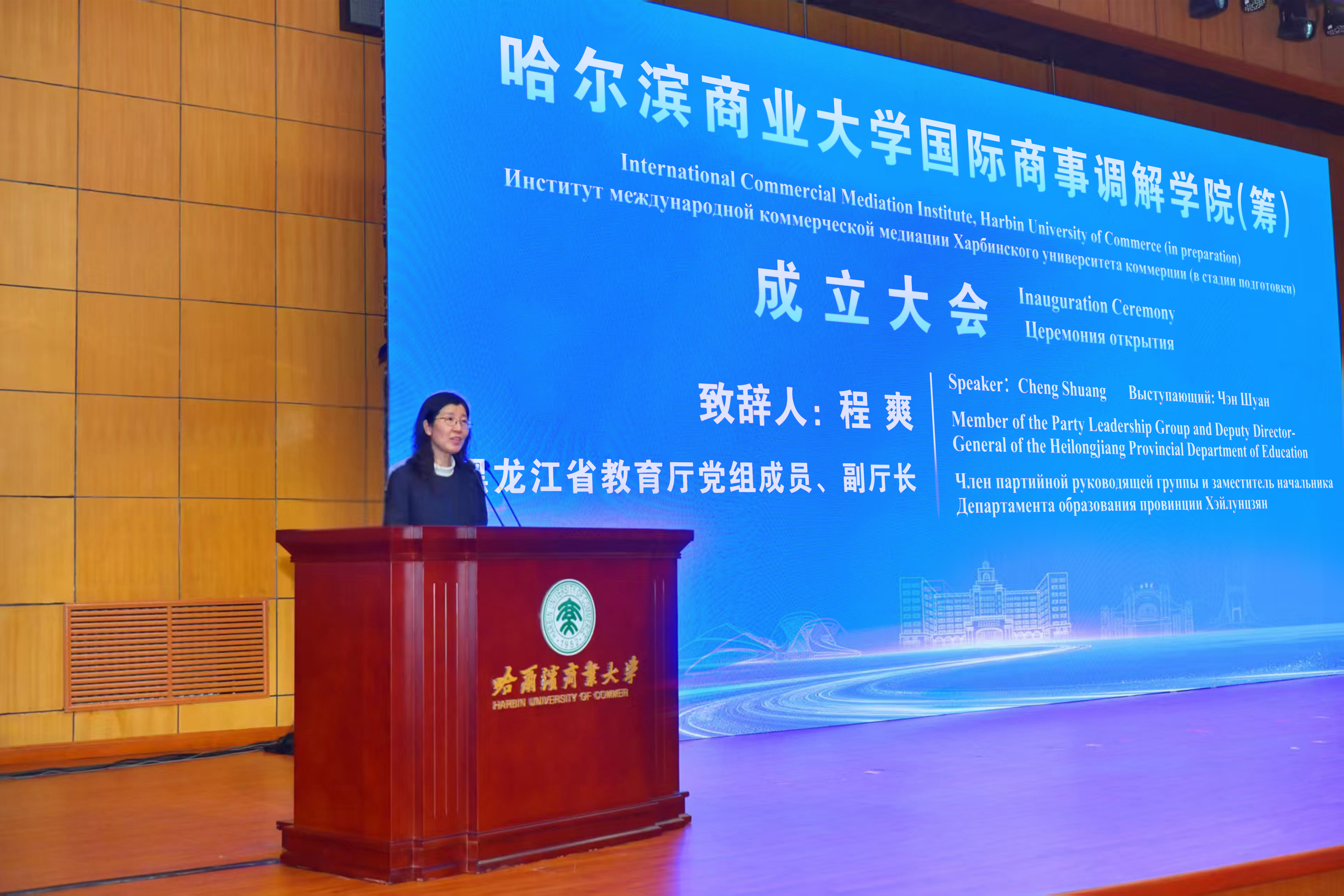 程爽在致辞中强调,省教育厅将主动顺应中国式现代化对高等教育提出的新要求、新使命,围绕建设彰显国家战略部署与龙江特色优势的“人才培养改革实验区”,持续加大对涉外法治人才培养协同创新平台的支持力度。她希望国际商事调解学院以成立为契机,积极探索“法学 + 外语 + 经贸”跨专业复合型人才培养新模式,创新人才培养机制,聚焦国际商事规则、跨境投资与贸易等前沿领域,深化法学与经济、管理等学科的交叉融合研究,产出更多服务国家战略、契合龙江发展的高质量智库成果,为涉外法治人才培养贡献龙江智慧。