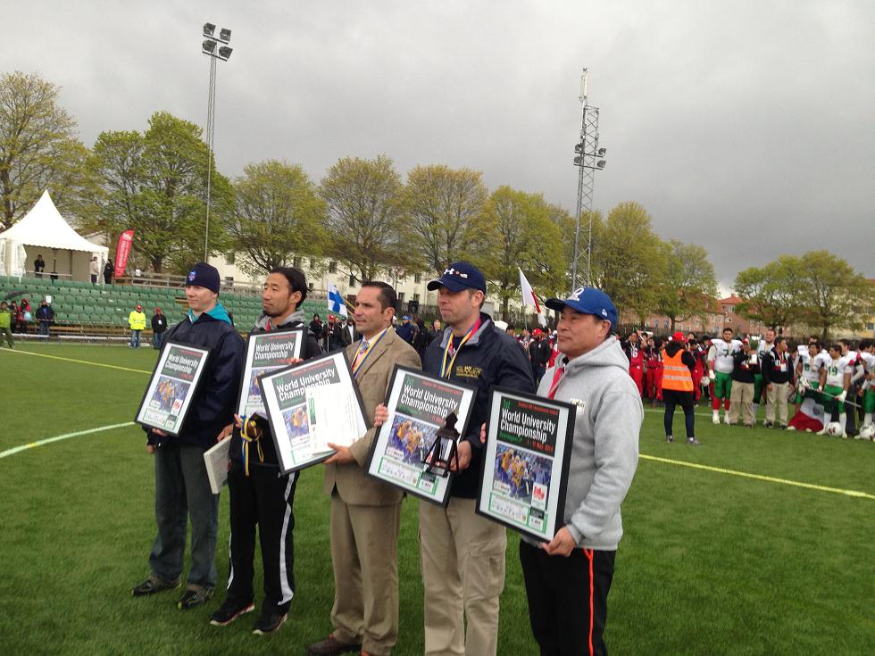 第一届世界大学生美式橄榄球锦标赛于当地时间5月13日下午在瑞典乌普萨拉降下帷幕。经过13天紧张激烈的角逐,最终墨西哥代表队技压群雄获得冠军,日本队获得亚军,瑞典、芬兰、中国分别获得三、四、五名。
