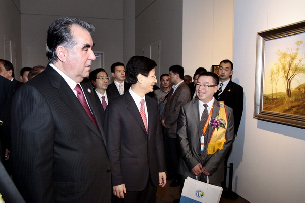 中共中央政治局委员、中央政法委书记孟建柱,塔吉克斯坦总统拉赫蒙等领导参观王宝成教授作品